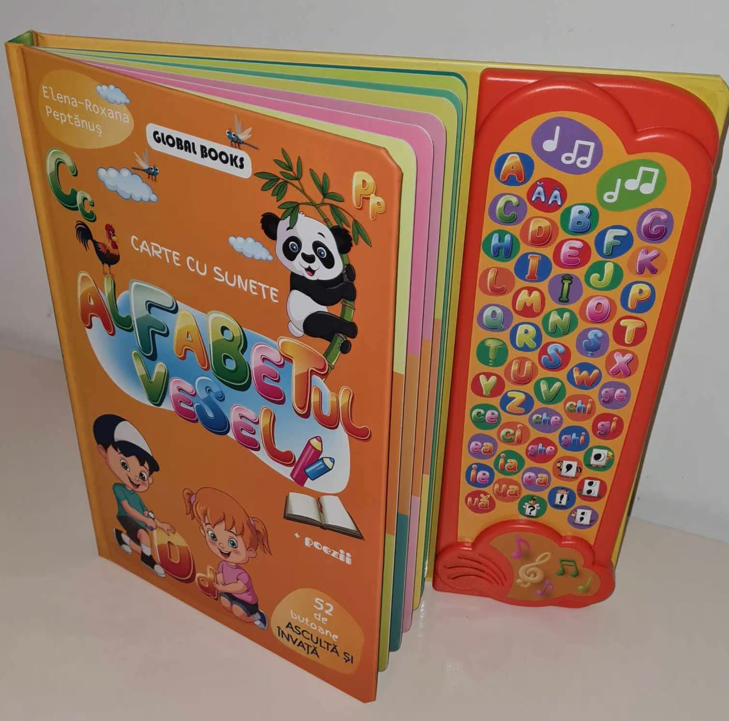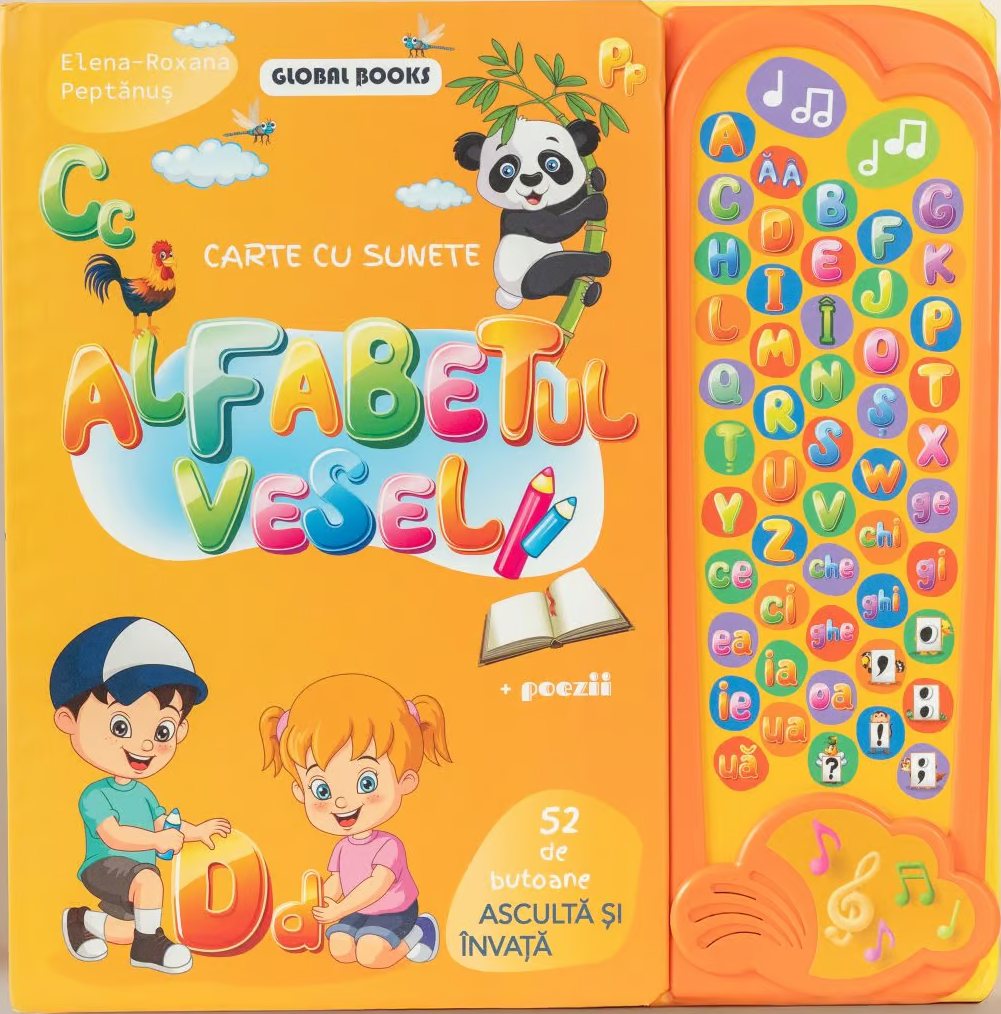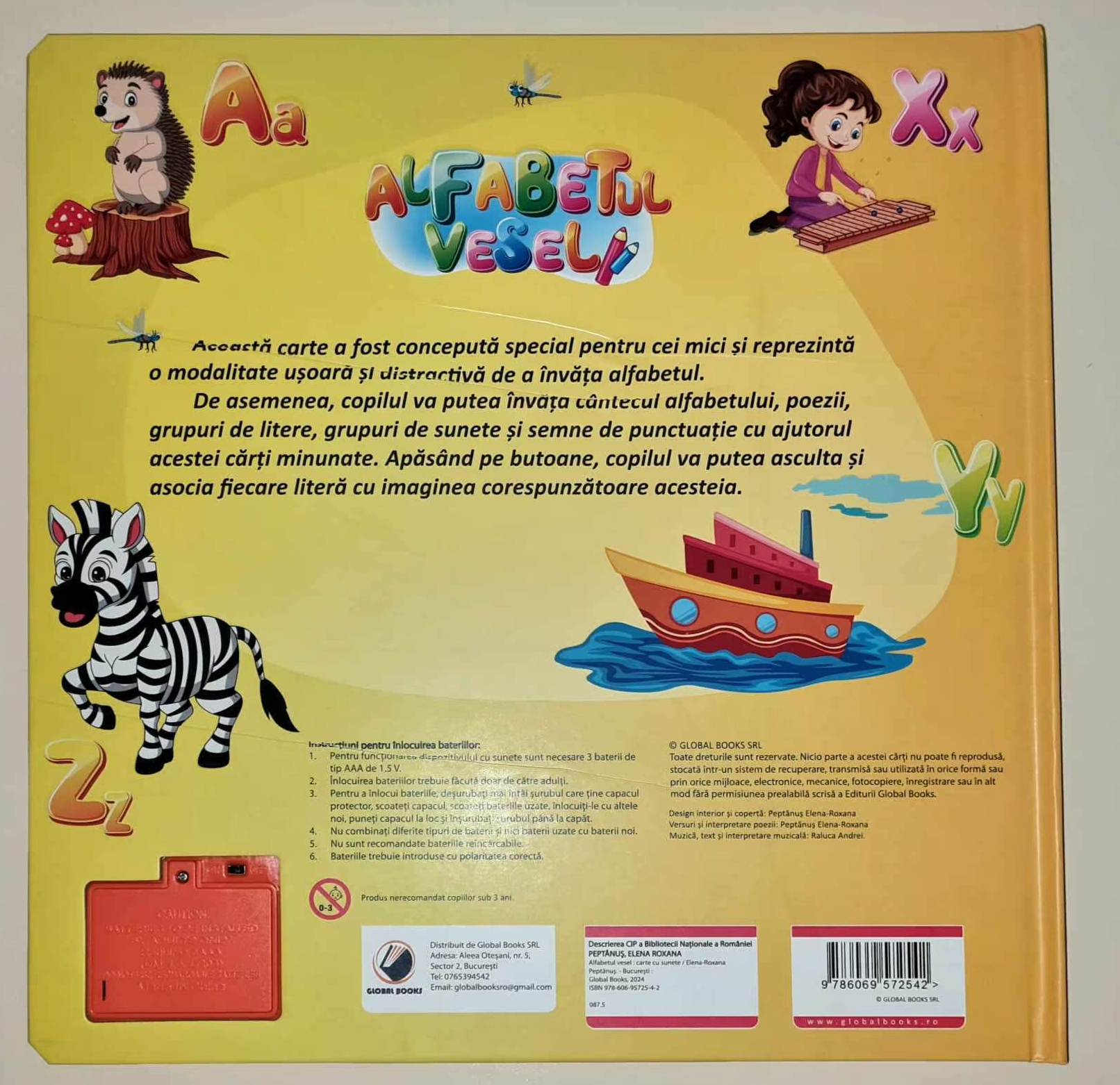 Învățare prin joacă: Cartea îi introduce pe cei mici în lumea literelor limbii române într-un mod simplu și interactiv, apăsând pe butoane și folosind ilustrații și rime captivante care îi vor atrage imediat pe copii.