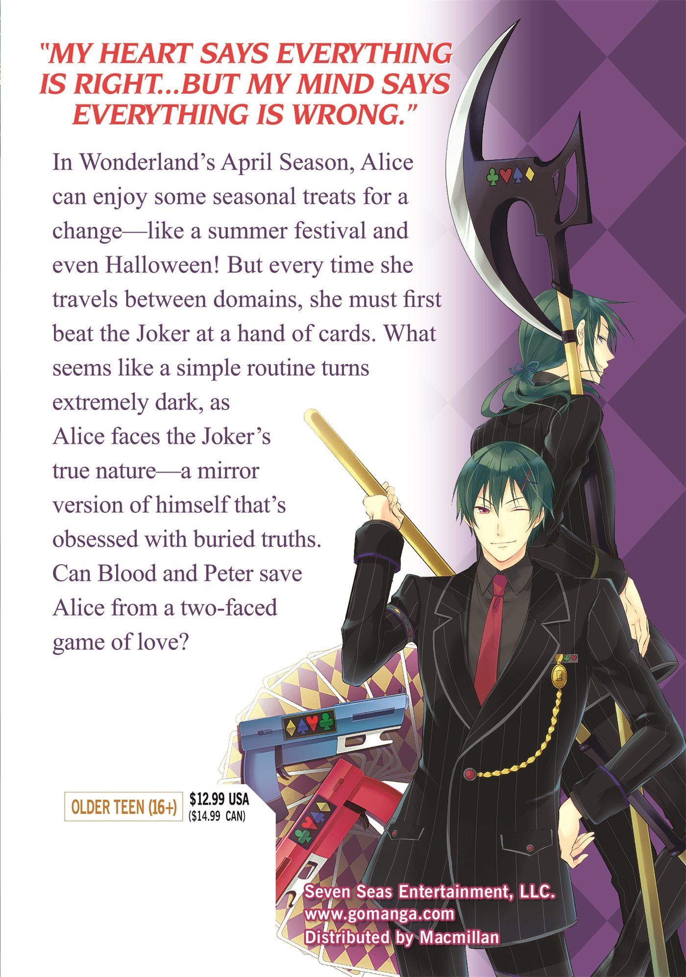 In April Season of Wonderland, Alice can enjoy some seasonal treats for a change—like a summer festival and even Halloween! But every time she travels between domains, she must first beat the Joker at a hand of cards. What seems like a simple routine turns extremely dark, and Alice is faced with Joker's true nature—and the mirror version of himself who's obsessed with buried truths. Can Blood and Peter save Alice from Joker...and herself?