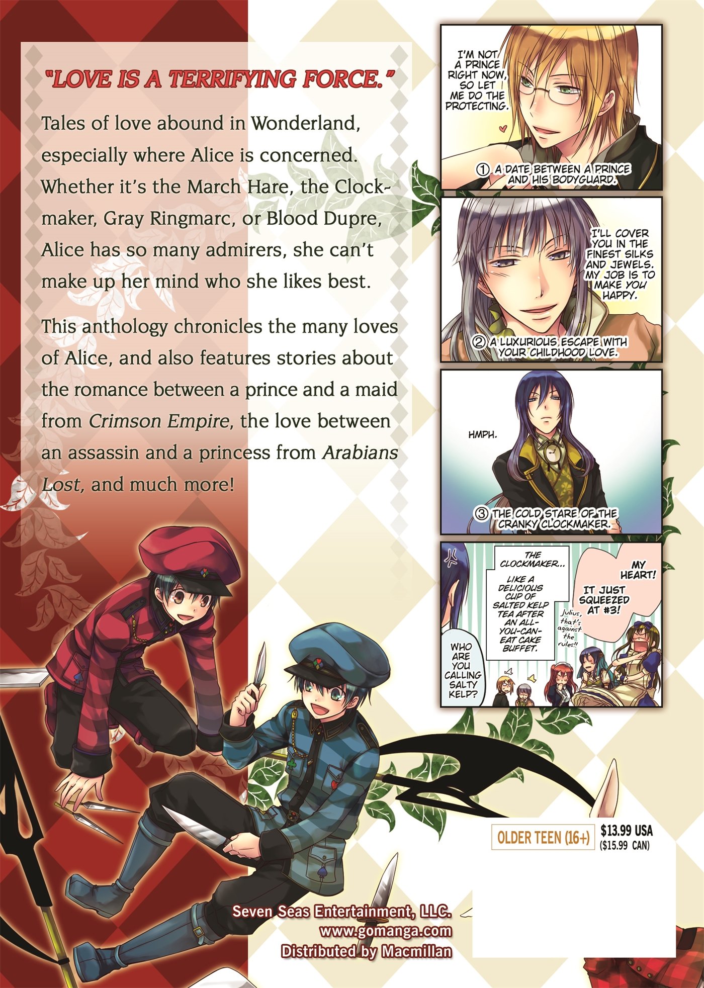 The love between an assassin and a princess. The love between a prince and a maid. Or maybe the love between the clockmaker and Alice. What about others? The Renai Otogibanashi (Love Fairytale) anthologies contain a collection of short stories for various different characters from their otome game series; Arabian Lost, Heart no Kuni no Alice, Clover no Kuni no Alice and Crimson Empire.
