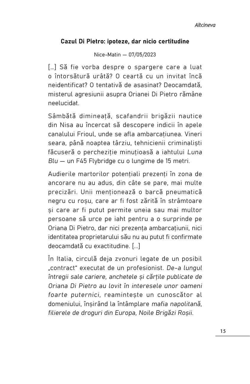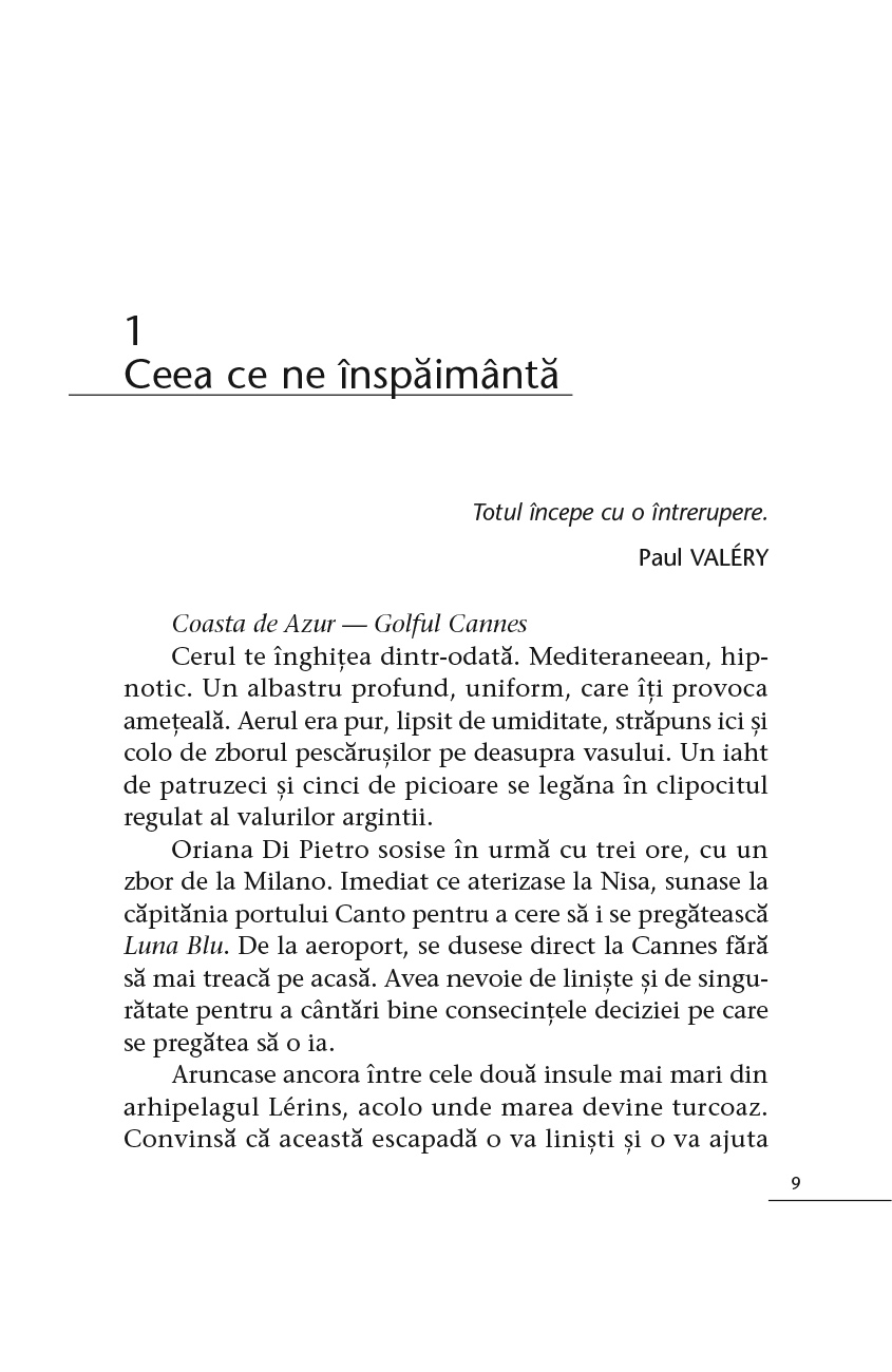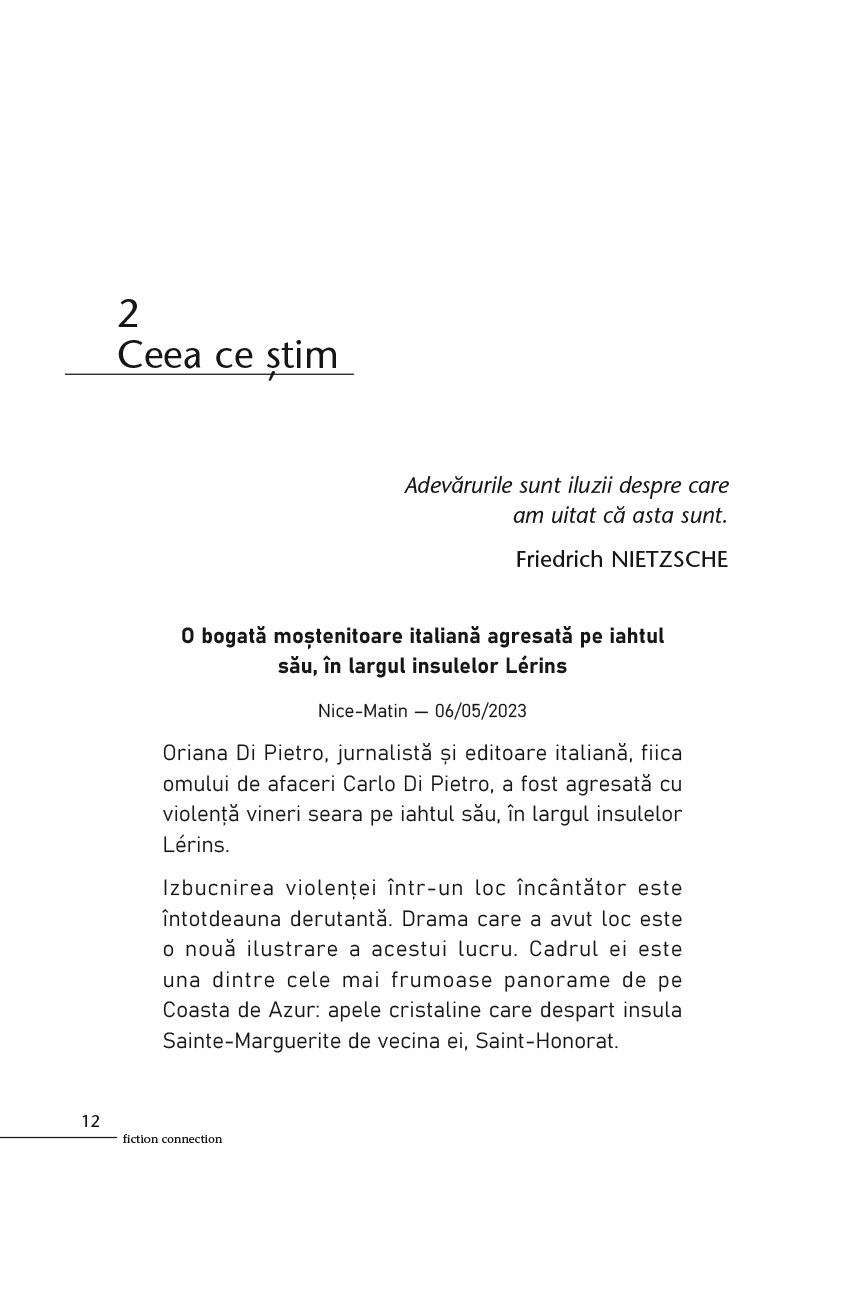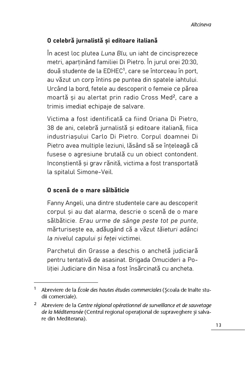 În largul stațiunii Cannes, un iaht plutește în derivă printre insulele Lérins. La bordul lui se află Oriana Di Pietro, editoare italiană și moștenitoarea unei celebre familii milaneze. Agresată cu sălbăticie, ea va muri după zece zile petrecute în comă.