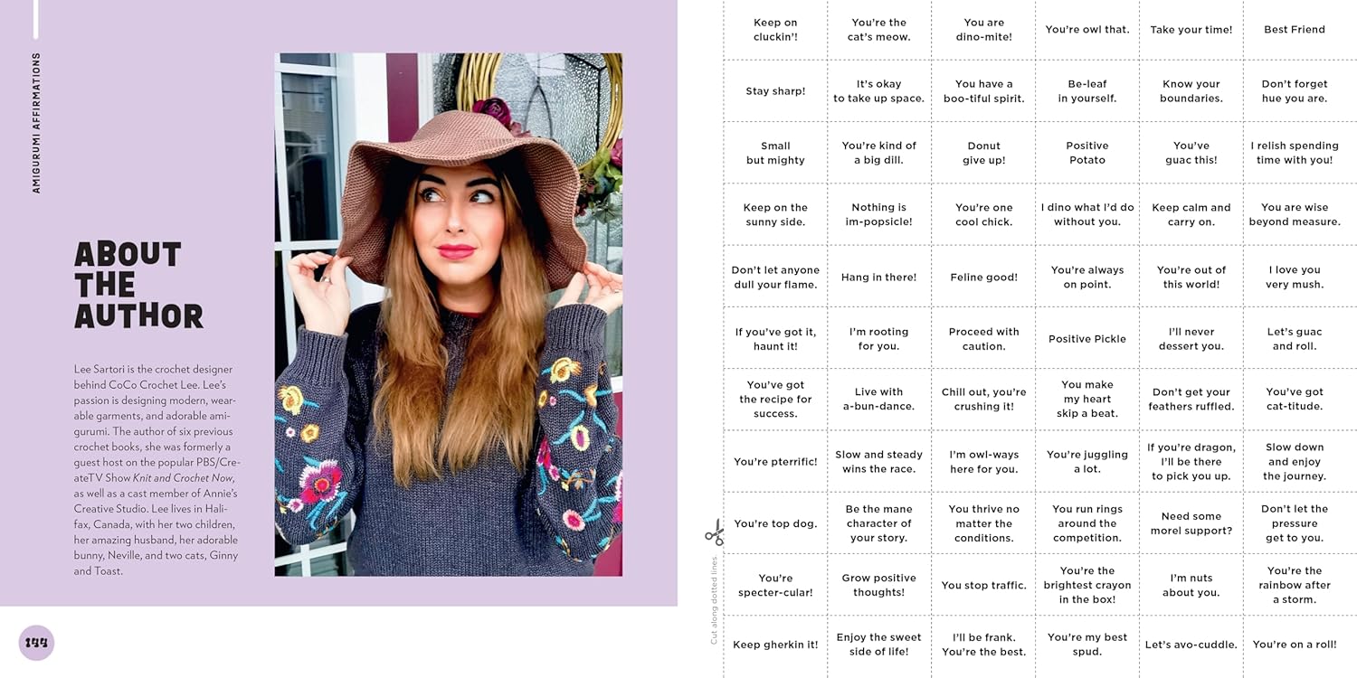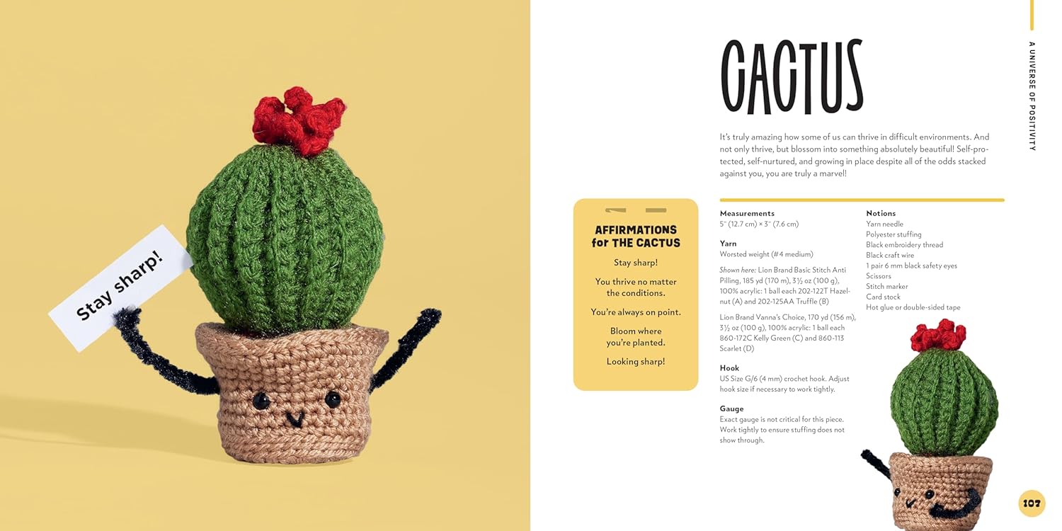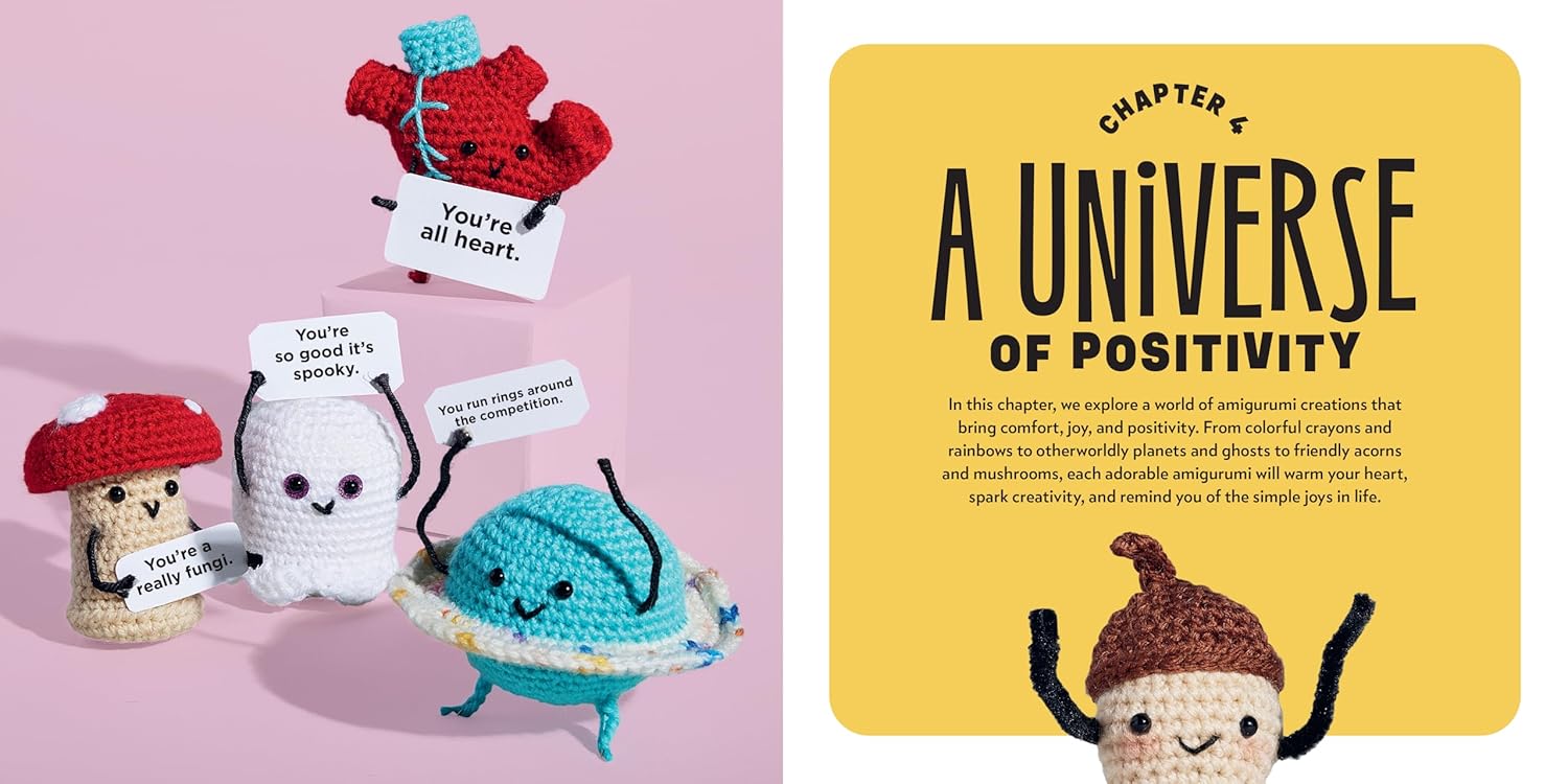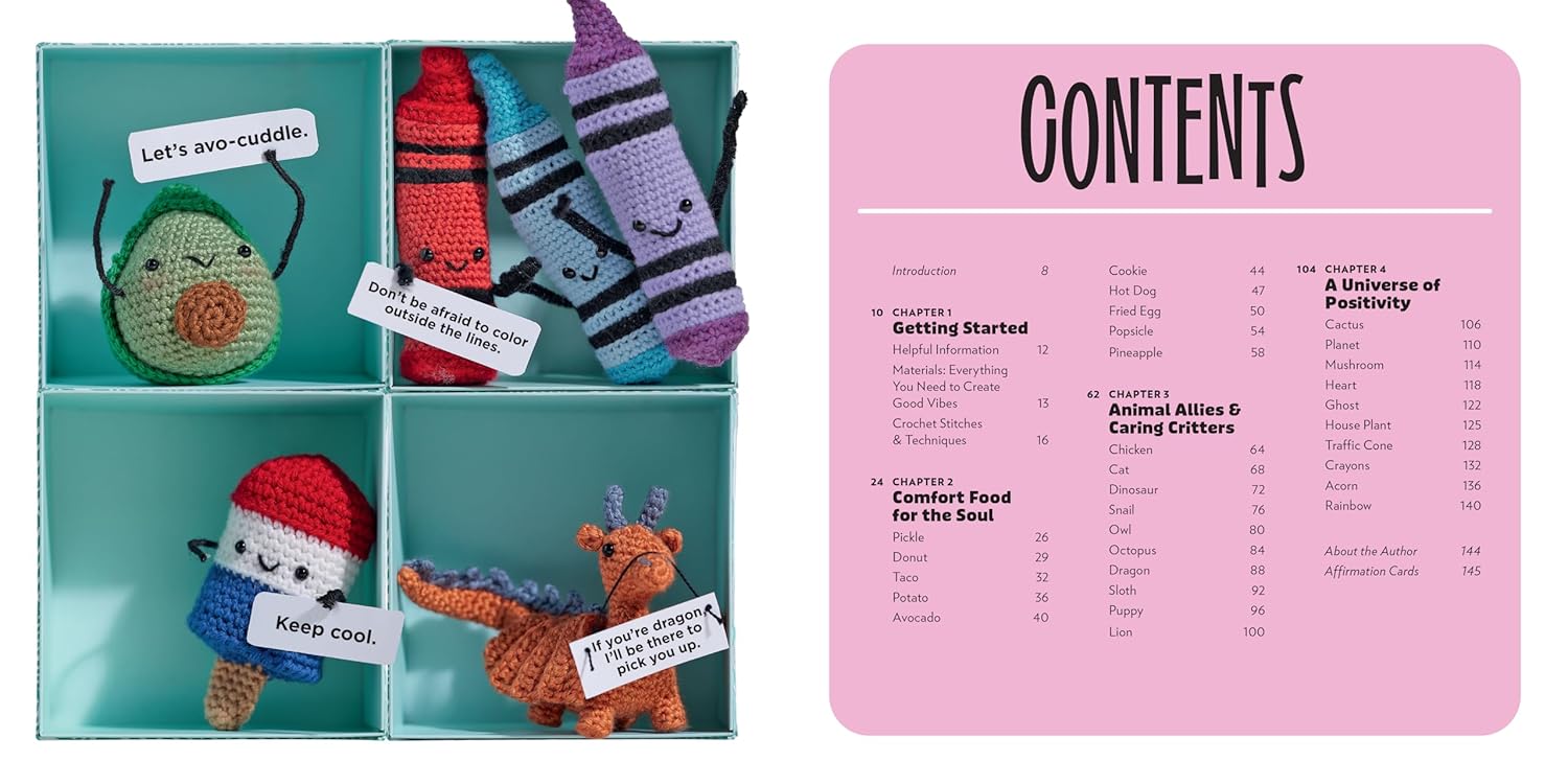 • 30 adorable amigurumi patterns: Featuring everything from tiny food items to lovable animals and playful plants, each with its own positive affirmation.