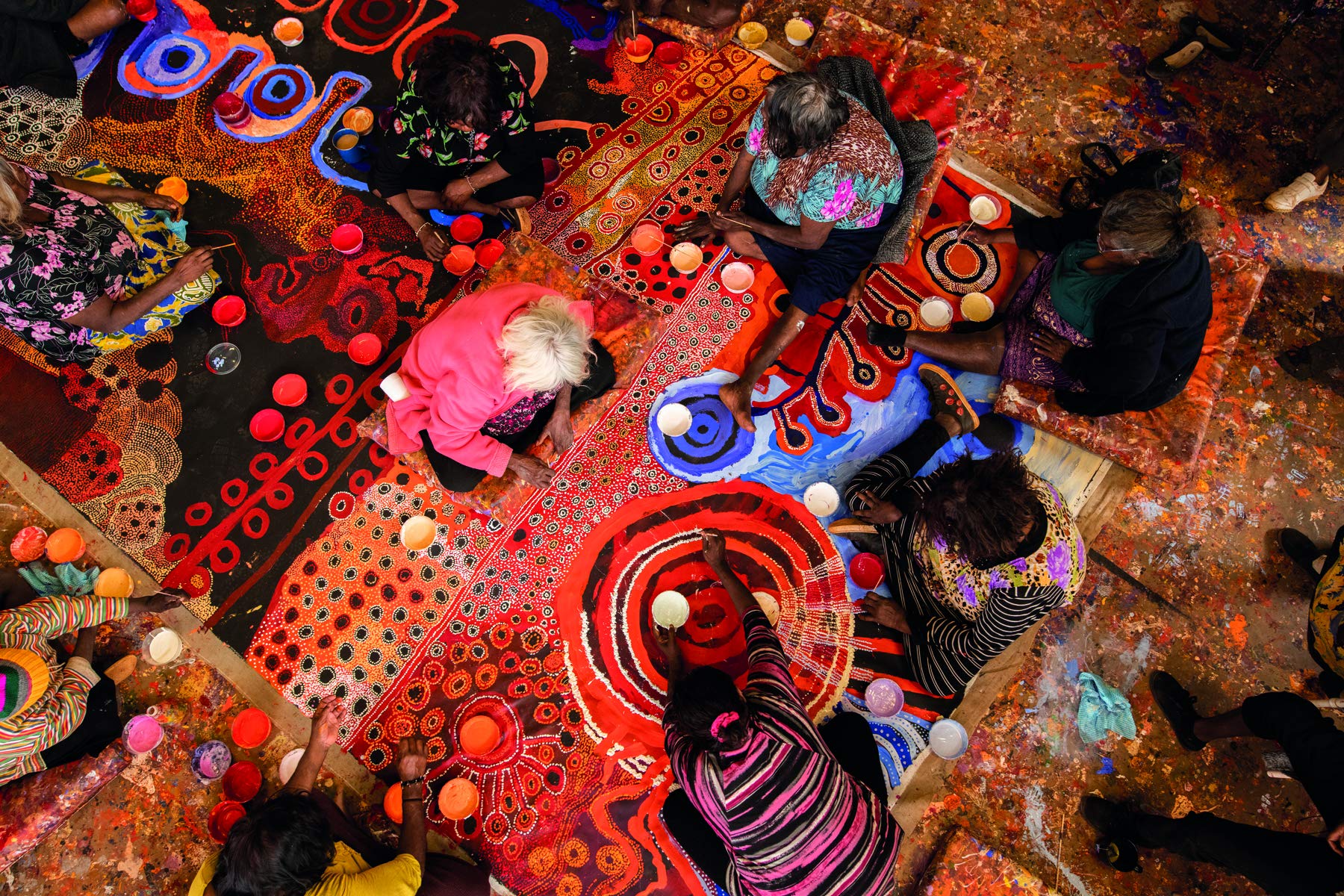 Produced in 2018, the sumptuous paintings, as is the Kulata Tjuta Kupi Kupi installation, are collaborative artworks. They are reminiscent of the collaborative production process of art in Aboriginal Australia.