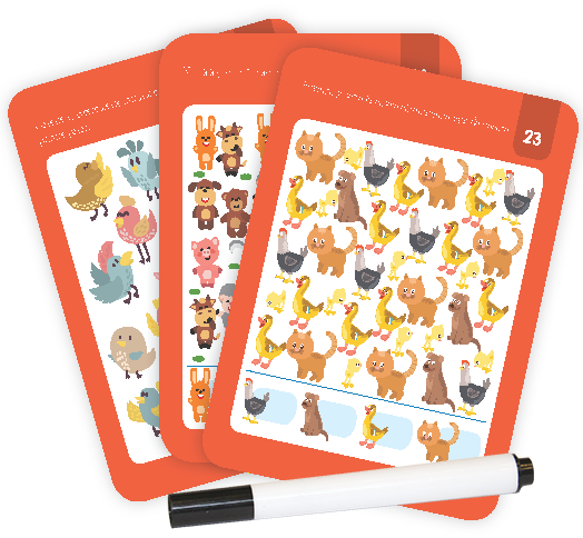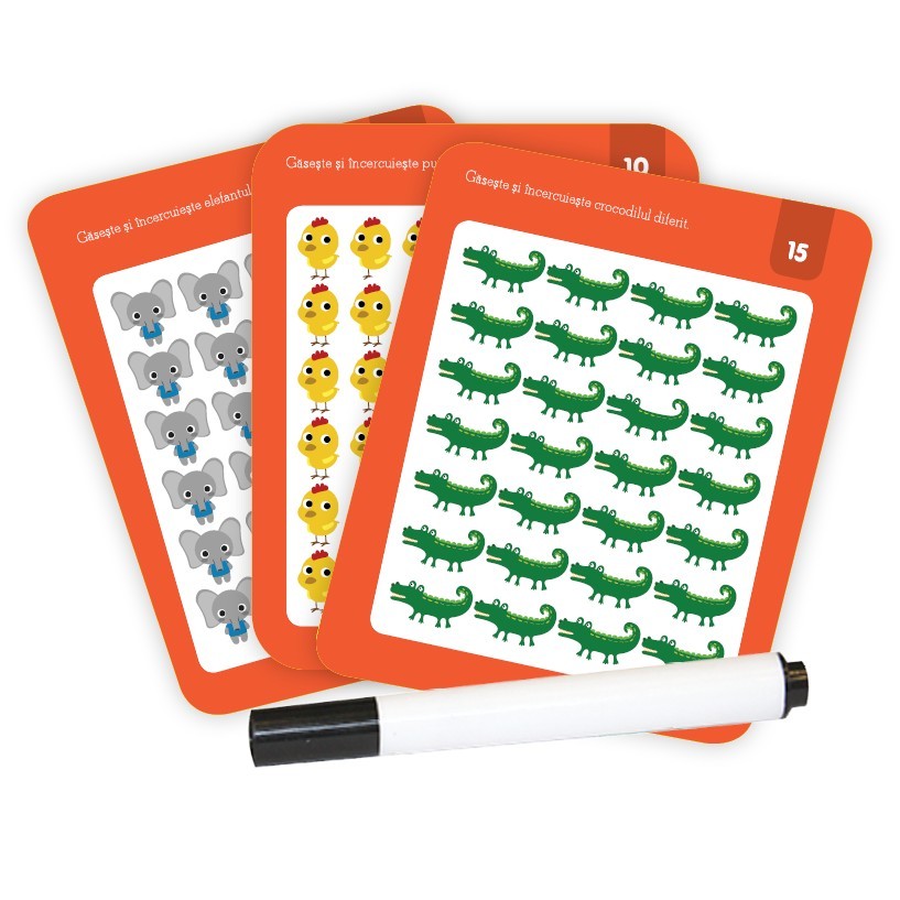 Pachetul include 5 tipuri de jocuri: găsește patru de același fel • găsește ce e diferit • numără și scrie câte sunt • găsește intrusul • găsește perechea. Aceast pachet este potrivit pentru copii prin dezvoltarea mai multor abilități mentale precum logica și concentrarea, care vor contribui la pregătirea intelectuală și pregătirea acestuia pentru viața școlară.