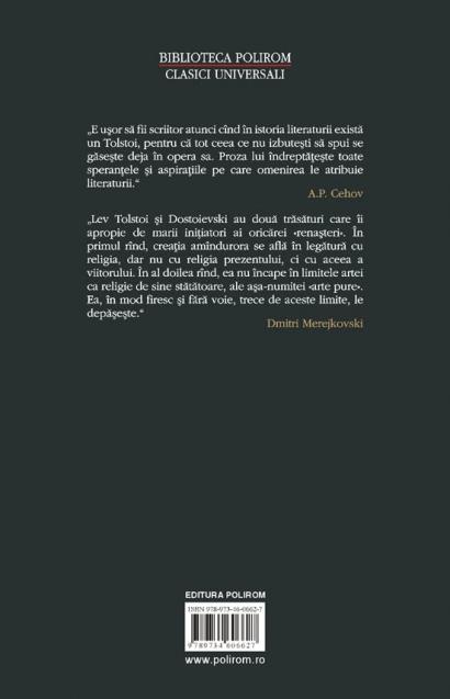 „Tolstoi este cel mai mare prozator rus. Iar maretia lui se datoreaza calitatii rare de a se adapta la statura noastra, la ritmul nostru. Proza lui e ritmata de bataile propriei noastre inimi, iar personajele sale par sa se miste la fel de firesc in lumea noastra ca trecatorii care ni se perinda pe sub ferestre in timpul lecturii.” (Vladimir Nabokov)
