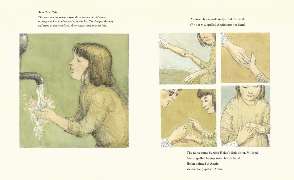 "What is breathtakingly shown here, through accurate, cross-hatched watercolor paintings; excerpts from Sullivan's correspondence to her former teacher; and concise and poetic language, is the woman's patience and belief in the intelligence of her student to grasp the concepts of language," praised School Library Journal in a starred review.Author Deborah Hopkinson and illustrator Raul Colón present the story of Helen Keller in a fresh and original way that is perfect for young children. Focusing on the relationship between Helen and her teacher, Annie Sullivan, the book is interspersed with excerpts of Annie's letters home, written as she struggled with her angry, wild pupil. But slowly, with devotion and determination, Annie teaches Helen finger spelling and braille, letters, and sentences. As Helen comes to understand language and starts to communicate, she connects for the first time with her family and the world around her. The lyrical text and exquisite art will make this fascinating story a favorite with young readers. Children will also enjoy learning the Braille alphabet, which is embossed on the back cover of the jacket.