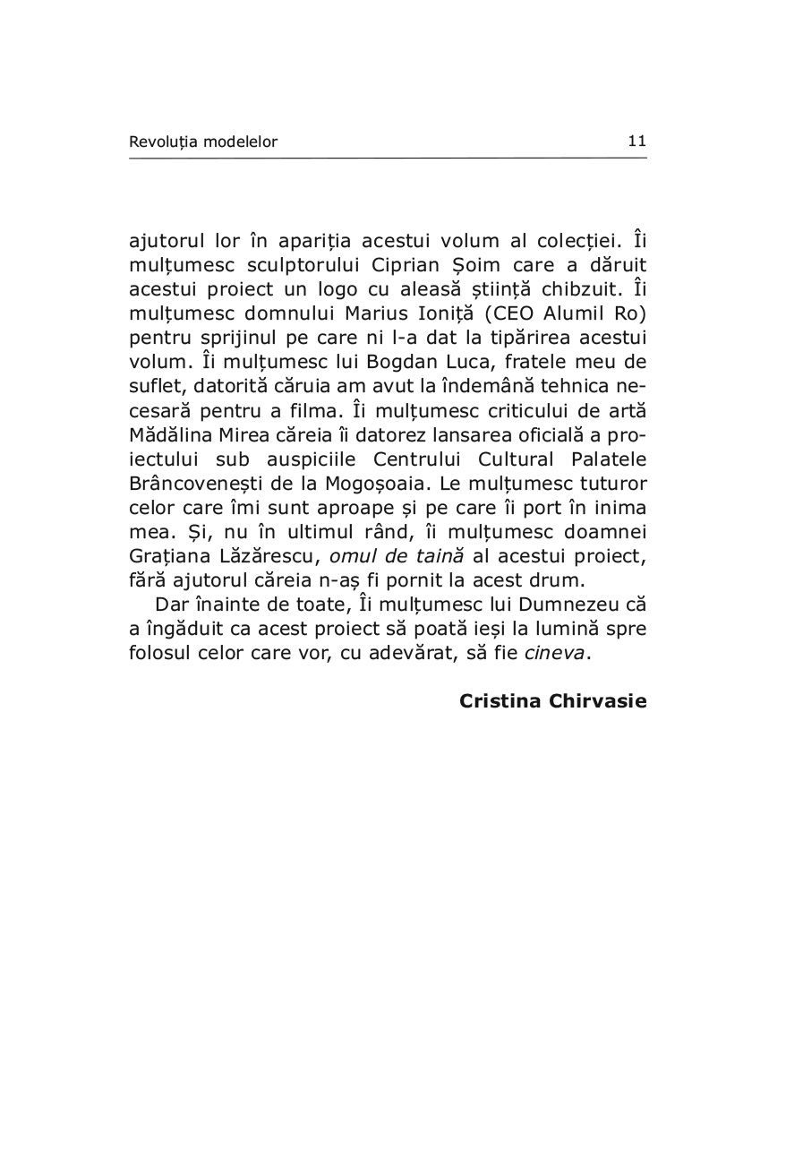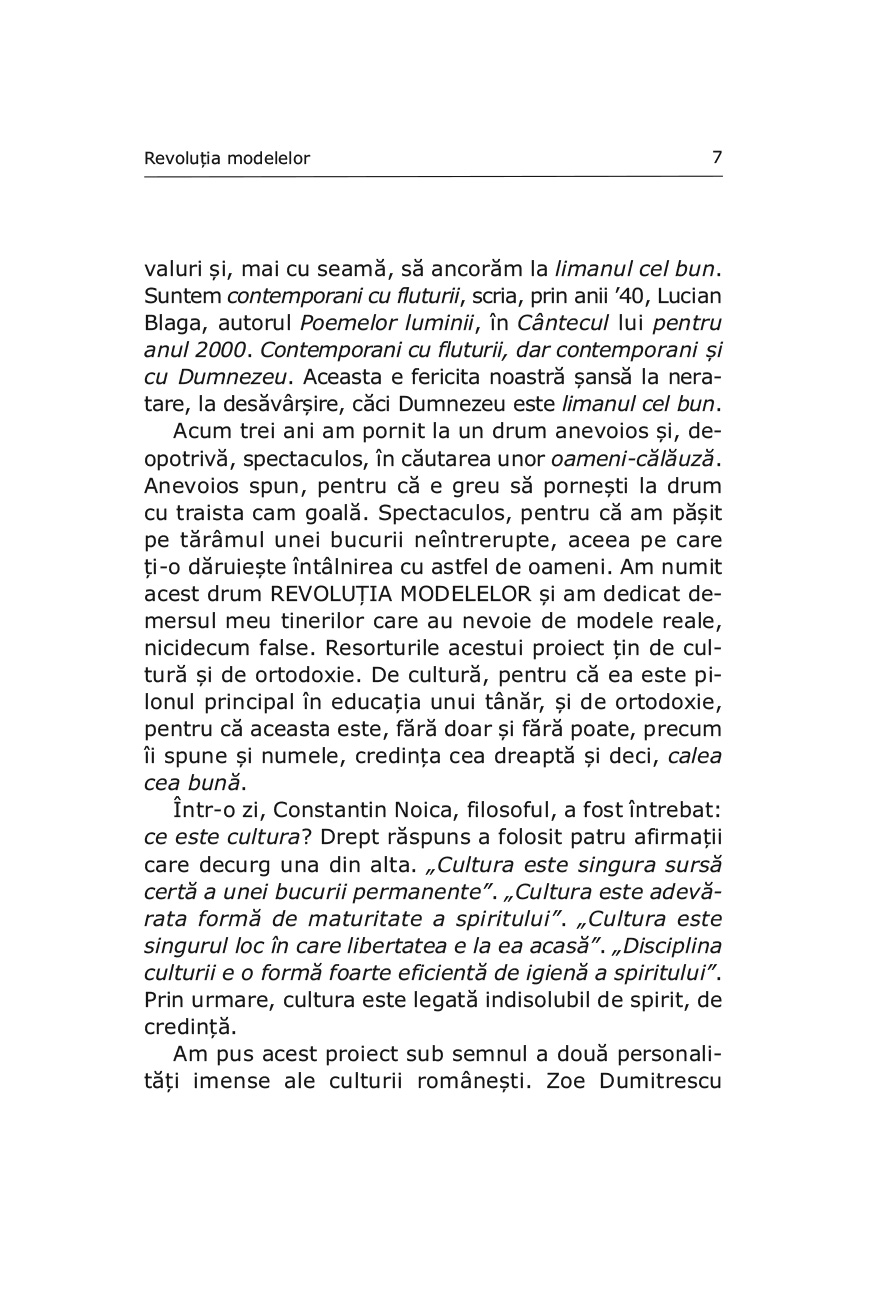 Modelele sunt oameni cultivați duhovnicește și în căutarea lor am pornit. Oameni care pot, prin viața lor, să fie pildă și ancoră pentru cei tineri. Și poate nu numai pentru ei. Caută și vei afla, ne spune Hristos. Așa am făcut. Și, cu îngăduința Lui, i-am aflat. Și m-am gândit că aceștia trebuie, mai întâi, văzuți căci tinerii preferă vizualul și e corect, atât vreme cât în era lui s-au născut. Am apelat, așadar, la atributele filmului documentar-eseu. Au rezultat mai multe filme gândite ca bază a unor conferințe în care publicul poate avea posibilitatea de a-i întâlni pe acești oameni-călăuză, de a întreba și de-a primi răspunsuri. Pe primii cinci dintre aceștia îi puteți întâlni și în volumul de față. Cuvântul trebuie să rămână totuși suveran! Filmele vor putea fi vizionate curând pe site-ul proiectului www.revolutiamodelelor.ro.