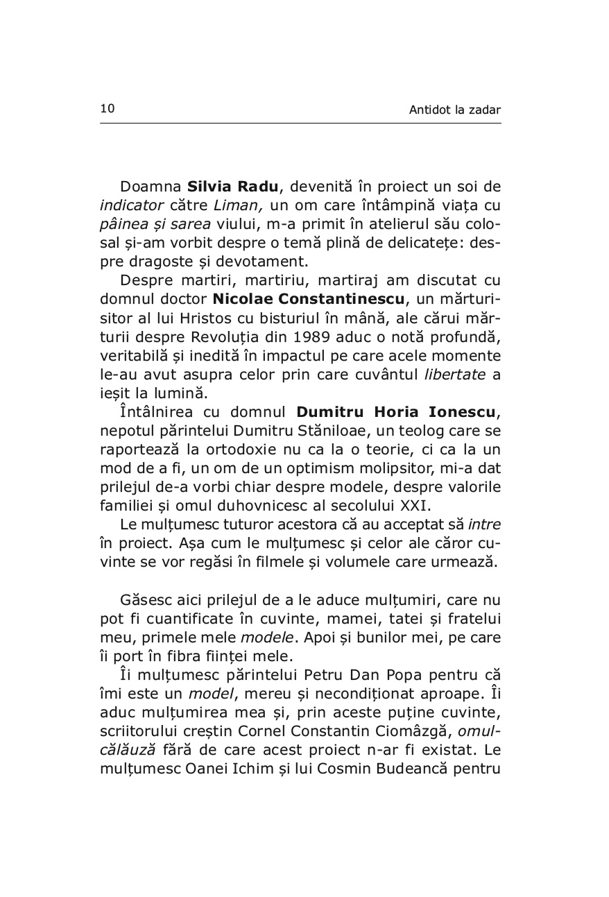Am dat numele acestui volum Antidot la zadar ca un omagiu adus doamnei Micaela Ghițescu care a plecat la Domnul anul trecut (2019). Un suflet de o delicatețe rară, un om-rană care a izbutit să mângâie memoria și care, precum veți vedea, ne învață că istoria e o întâlnire obligatorie, iar absența noastră de la parcursul ei e impardonabilă.