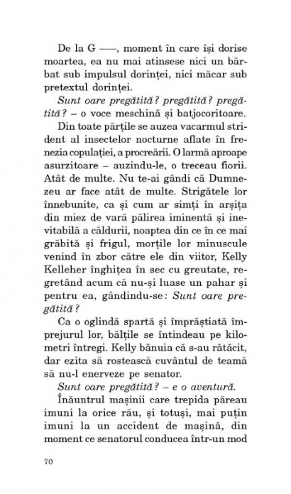 Inspirat de controversatul accident de masina al lui Ted Kennedy, romanul Apa neagra introduce brutal cititorul in atmosfera unei Americi dinamice, intens politizate, asa cum este ea vazuta de o fata idealista, educata, ambitioasa, dar timida si nesigura. Ca intr-un traseu de roller-coaster, cu susurul amenintator al apei negre in fundal, Kelly Kelleher isi traverseaza mental, ca intr-un sir de instantanee, prezentul si trecutul, viata si moartea. Stari si sentimente contradictorii se succed si se amesteca halucinant. Frustrari, anxietati, sperante, iluzii si dezamagiri sunt, rand pe rand, tolerate, traite la intensitate maxima sau disecate la rece, odata cu deconstructia unei societati bazate pe o aparenta siguranta si onestitate, sustinuta de parinti grijulii si supravegheata de barbati puternici, cu conduita impecabila, condusi de inalte idealuri democratice.
