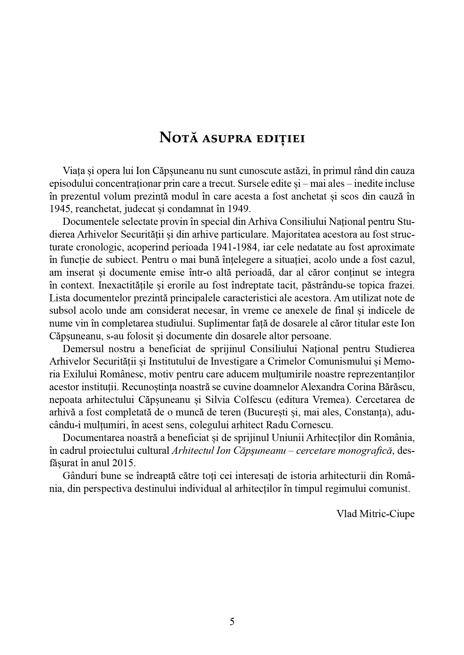 Viața și opera lui Ion Căpșuneanu nu sunt cunoscute astăzi, în primul rând din cauza episodului concentraționar prin care a trecut. Sursele edite și – mai ales – inedite incluse în prezentul volum prezintă modul în care acesta a fost anchetat și scos din cauză în 1945, reanchetat, judecat și condamnat în 1949.