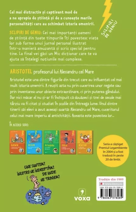 SCLIPIRI DE GENIU: Cei mai importanți oameni de știință din toate timpurile îți povestesc viața lor sub forma unui jurnal personal ilustrat într-o manieră amuzantă și scris special pentru tine. La final vei găsi un Mic dicționar care te va ajuta să înțelegi noțiunile mai complexe.