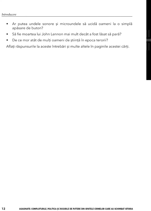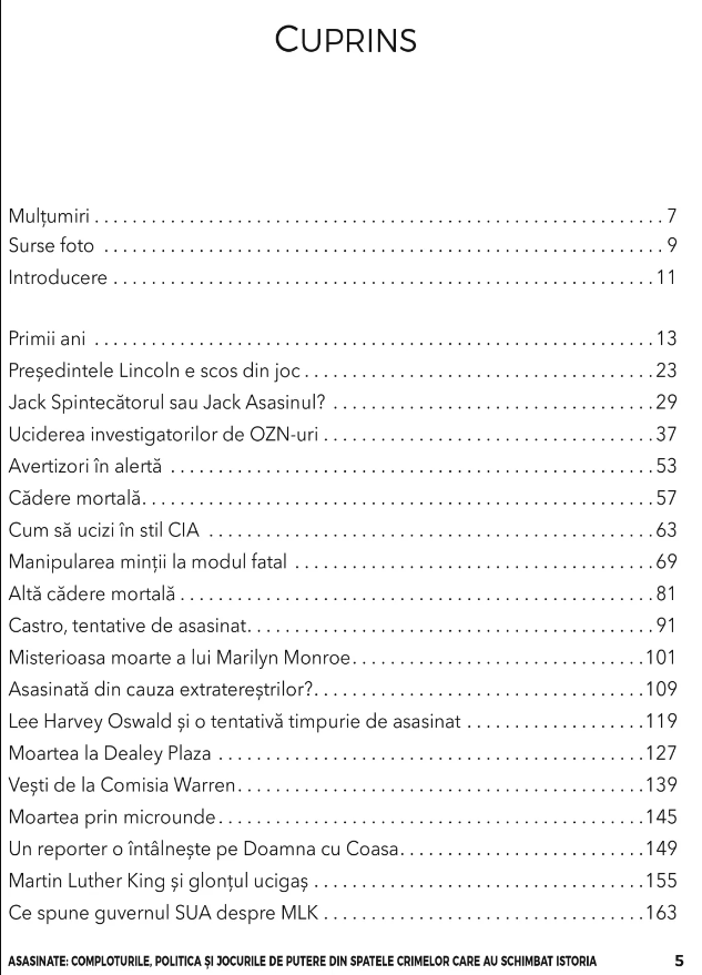 Oare Lee Harvey Oswald chiar l-a omorat pe JFK? Era Jack Spintecatorul cel ce a semanat teroare in Londra, la 1888 vreun ucigas nebun sau un nemilos agent secret al guvernului britanic? Si-a luat Marilyn Monroe singura viata ori s-a pus un pret pe capul ei? Ce anume a condus la moartea lui Danny Casolaro, ziarist de investigatii, care, in 1991, anul trecerii sale in nefiinta, cerceta o puternica organizatie secreta, „Caracatita”? A fost Diana, Printesa de Wales, victima unui accident rutier sau a unui complot minutios lucrat? Raspunsurile la aceste intrebari si la multe altele le veti afla citind Asasinate, cartea care dezvaluie motivele pentru care multe personaje celebre si-au aflat sfarsitul nemilos.