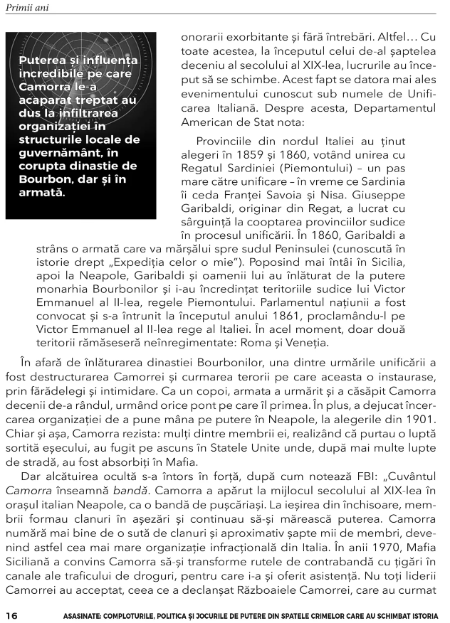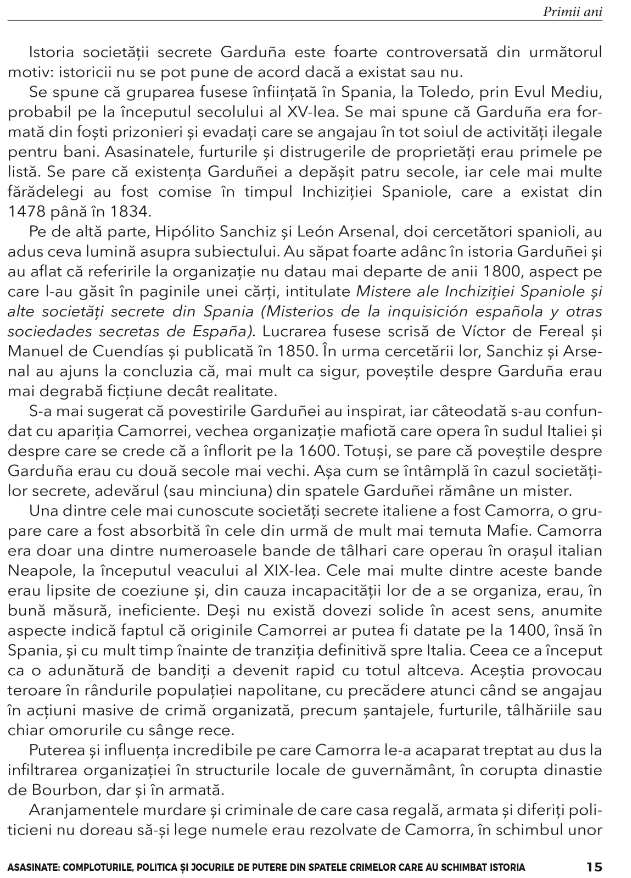 Ucigasi fara scrupule si criminali tocmiti: sunt aici, acolo, pretutindeni. Adulmeca din umbra, gata de atac. Lichideaza la ordin. Schimba cursul Istoriei. Asasinate: Comploturile, politica si jocurile de putere din spatele crimelor care au schimbat istoria va capteaza intr-o lume plina de crime aranjate in chip de sinucideri, omucideri facute sa para atacuri de cord sau sucombari la supradoze si accidente care, de fapt, au fost morti premeditate cu grija.