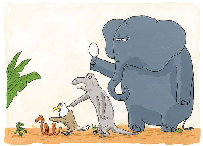 În junglă, un brotac dă peste un ou. Dar și șarpele vrea oul, și vulturul, și varanul… Intră în scenă şi elefantul, care pune paie pe foc. Ce se va întâmpla cu oul până la urmă?