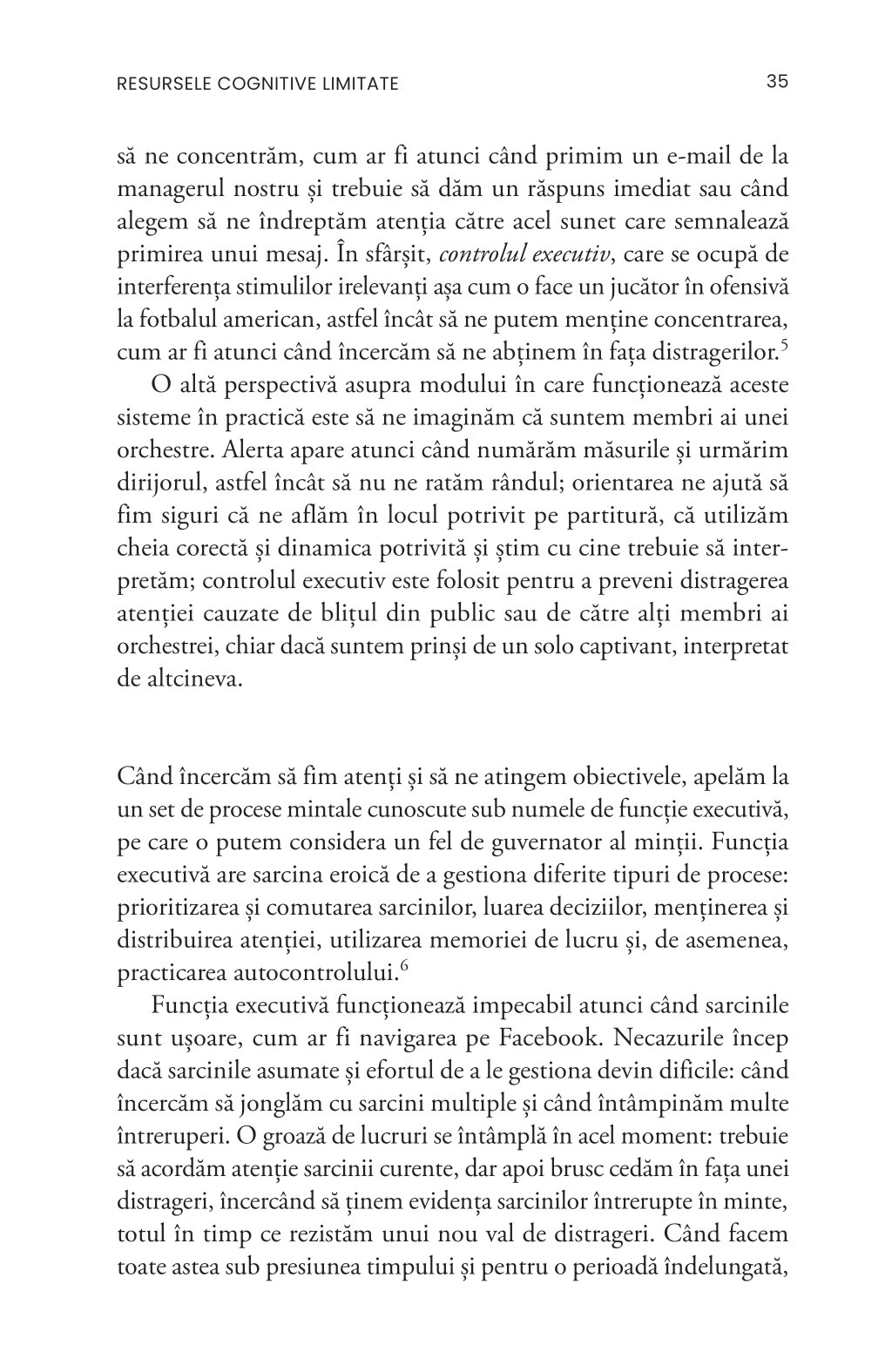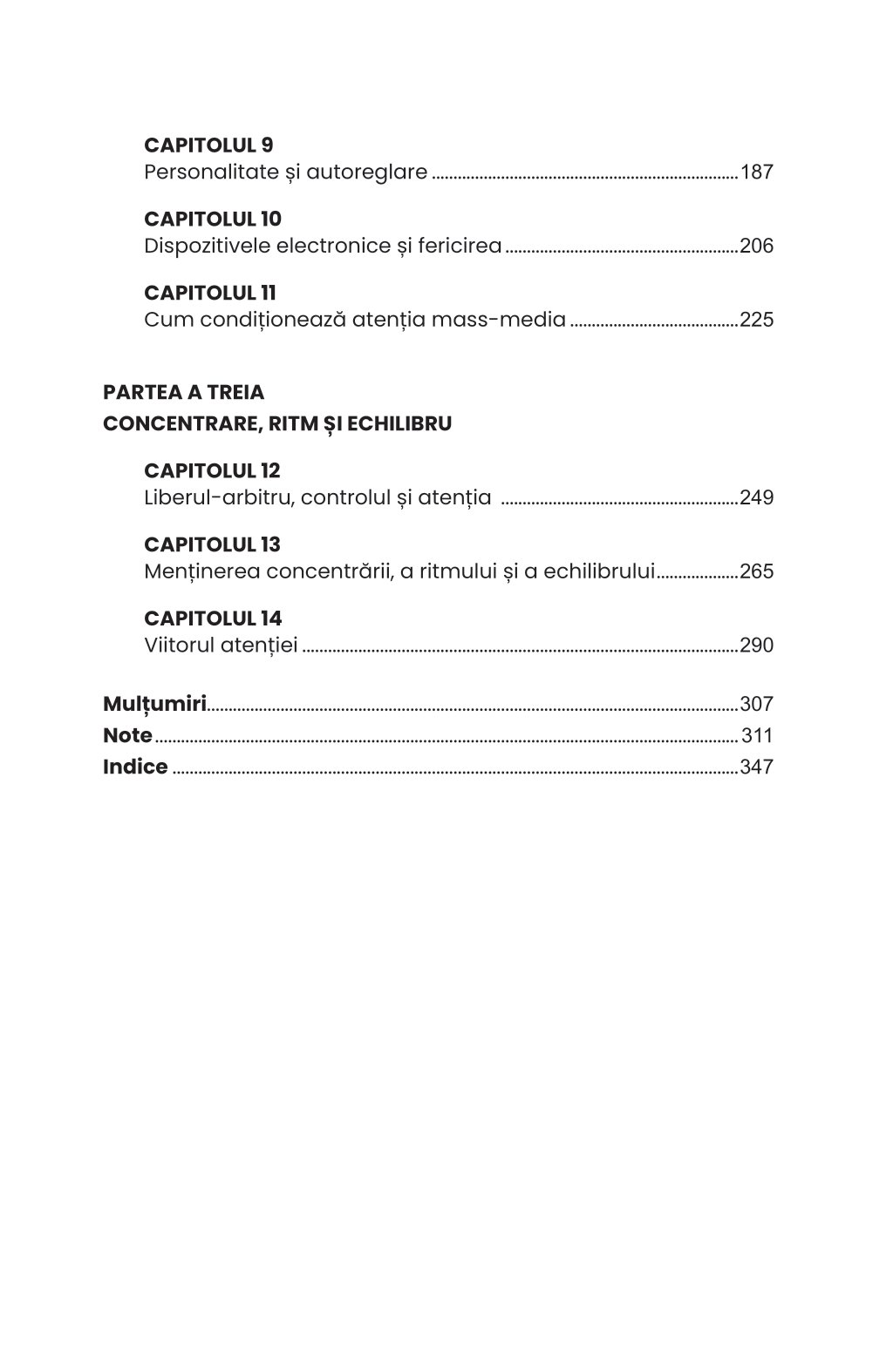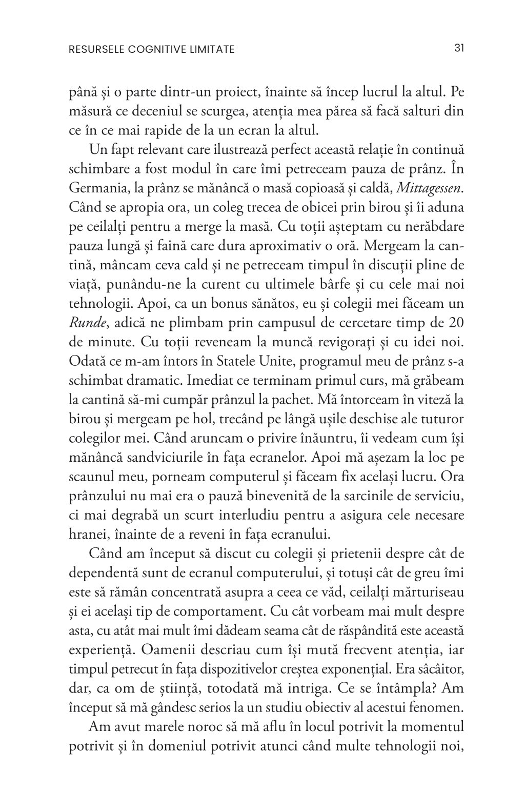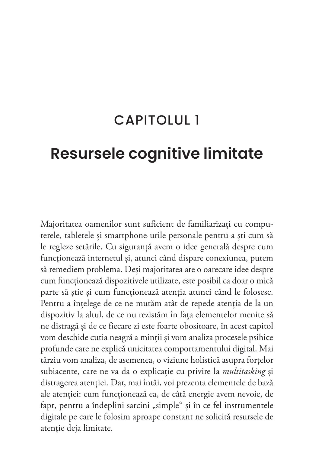 De exemplu, contrar opiniei populare, o scurtă pauză voluntară îți poate reface resursele cognitive. O activitate captivantă sau întreprinsă mecanic elimină stresul. Însă impactul internetului asupra capacității de concentrare nu trebuie neglijat. Cum să mai procesezi informațiile dacă rămâi cu gândul la conținutul media? Cum să reduci influența rețelelor de socializare asupra performanței la serviciu? Iată doar două dintre multele probleme la care, din fericire, descoperi acum soluțiile în acest volum.