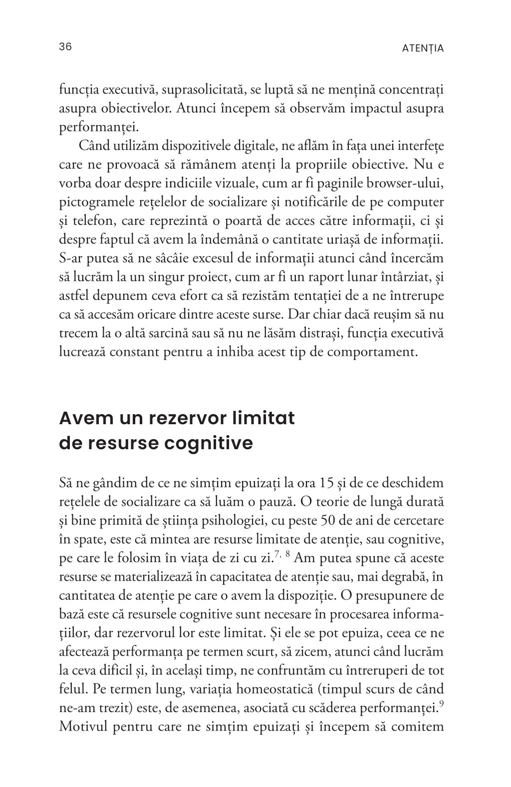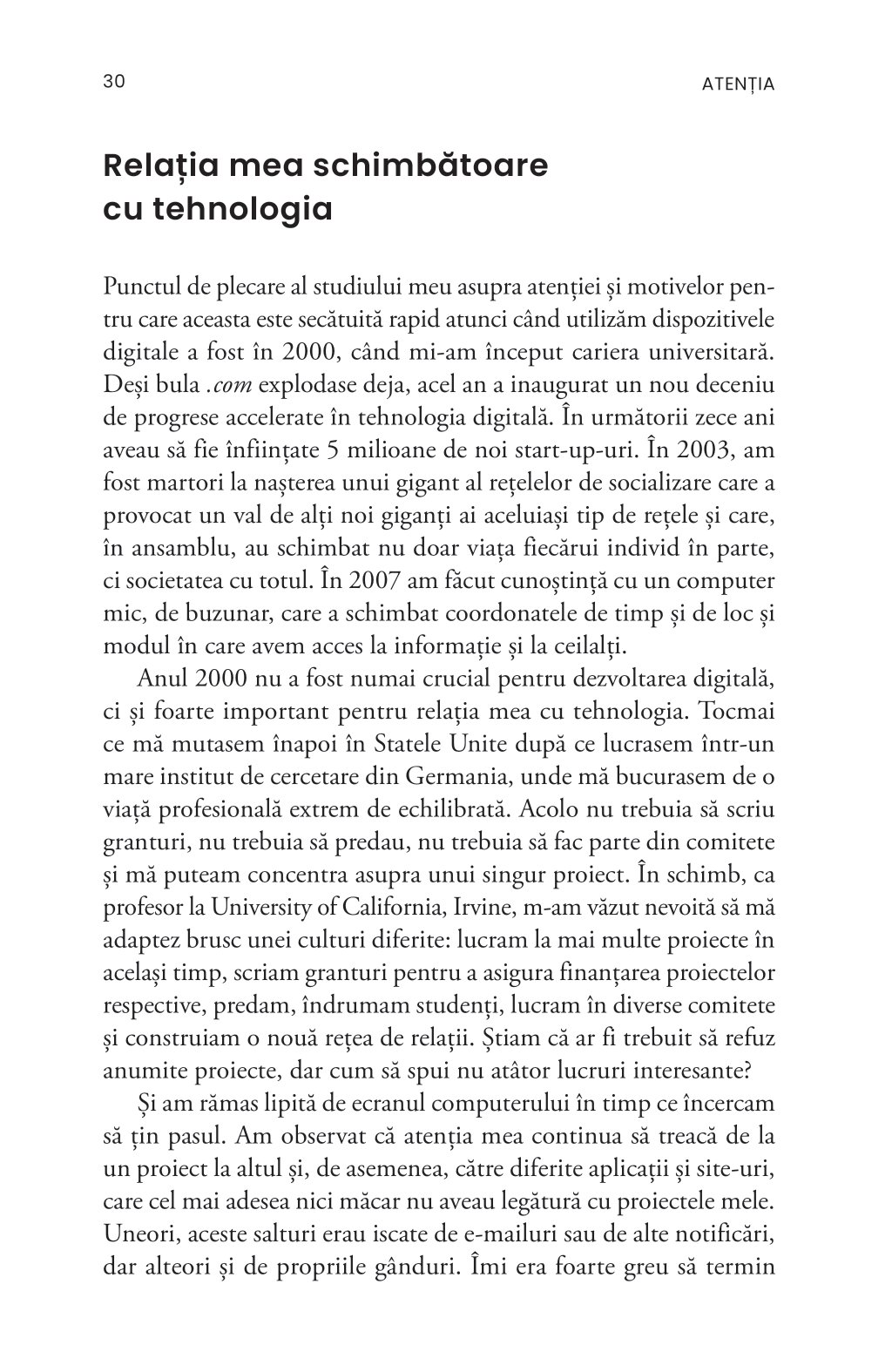 Lucrarea de față e bazată pe zeci de ani de cercetare despre efectul computerizării asupra vieții personale: cât de suprasolicitați am devenit, cum ne asumăm din ce în ce mai multe sarcini, cum suntem întrerupți în mod constant. Intervalul nostru de atenție a scăzut la 47 de secunde. Dacă vrei să afli cum să acționezi eficient în era digitală, Atenția e o lectură obligatorie.