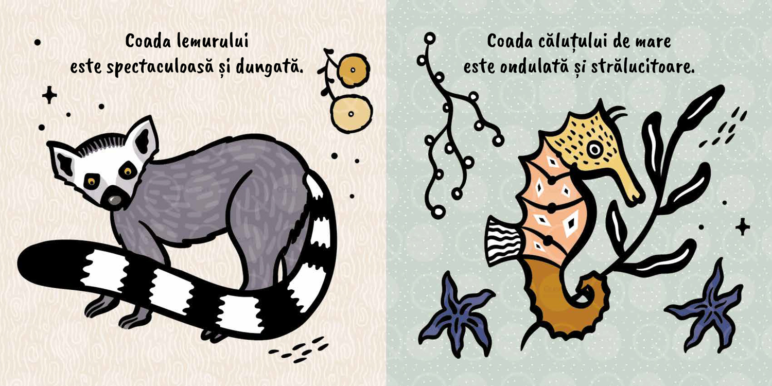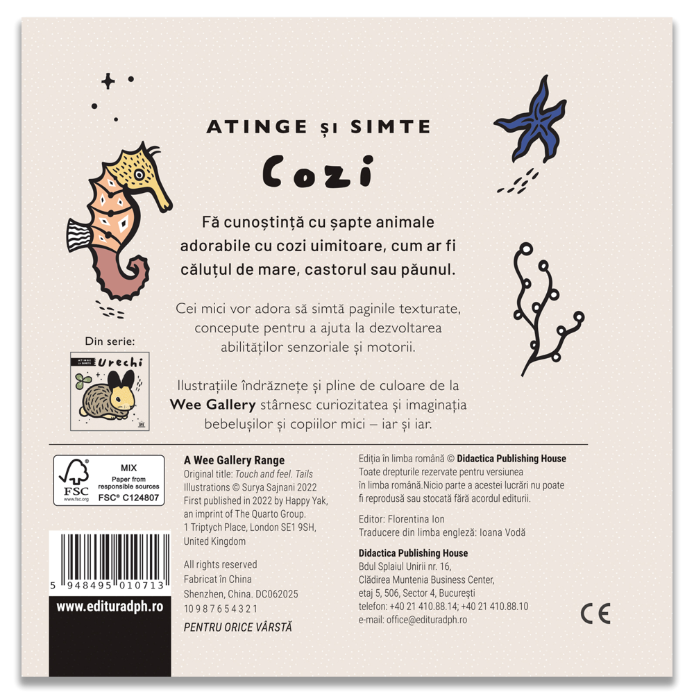 „Atinge și simte – Cozi” îi invită pe cei mici să descopere lumea fascinantă a animalelor prin intermediul texturilor. Cartea prezintă șapte animale adorabile, fiecare cu o coadă unică – de la coada dungată a lemurului, la coada pufoasă a veveriței sau cea colorată a păunului.