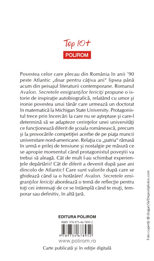 Povestea celor care plecau din România în anii ’90 peste Atlantic „doar pentru cîţiva ani” lipsea pînă acum din peisajul literaturii contemporane. Romanul Avalon. Secretele emigranţilor fericiţi propune o istorie de inspiraţie autobiografică, relatînd cu umor şi ironie povestea unui tînăr care urmează un doctorat în matematică la Michigan State University. Protagonistul trece prin încercări la care nu se aşteptase şi care-l determină să se adapteze cerinţelor unei universităţi ce funcţionează diferit de şcoala românească, precum şi la provocările competiţiei acerbe de pe piaţa muncii universitare nord-americane. Relaţia cu „patria” rămasă în urmă e prilej de tensiune şi nostalgie pe măsură ce se apropie momentul cînd protagonistul poveştii va trebui să aleagă. Cît de mult l-au schimbat experienţele depărtării? Cît de diferit a devenit după şase ani dincolo de Atlantic? Care sunt valorile după care se ghidează cînd ia o hotărîre? Avalon. Secretele emigranţilor fericiţi abordează o temă de reflecţie pentru toţi cei interesaţi de ce se întîmplă cînd te muţi, temporar sau definitiv, în altă ţară.