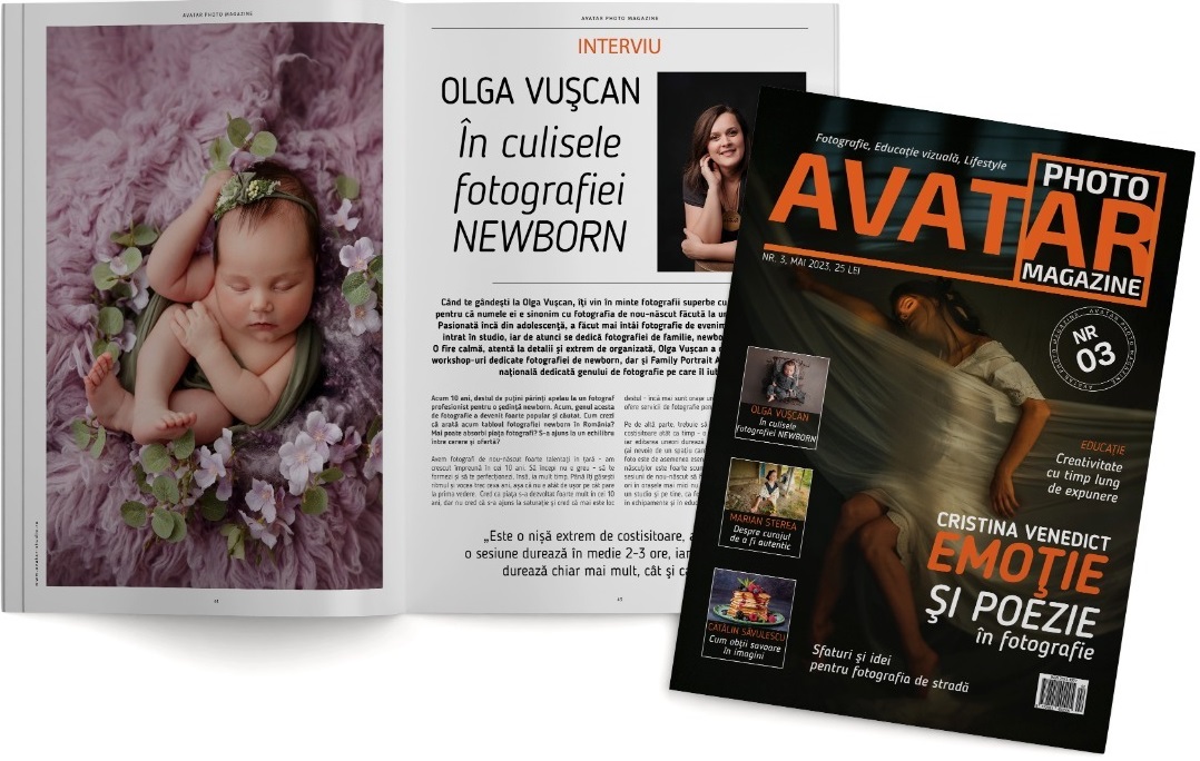 Numarul 3 al revistei Avatar Photo Magazine cuprinde o serie de interviuri foarte faine cu fotografi din domenii diferite – Olga Vuscan ne vorbeste despre fotografia newborn, despre organizarea unei sedinţe foto si relatia cu parintii, Cristina Venedict despre portretele sala cu un aer boem si poetic, Catalin Savulescu ne explica tehnici si idei in fotografia culinara iar Marian Sterea ne vorbeste despre fotografia de nunta si portret, promovare si curajul de a fi autentic.
