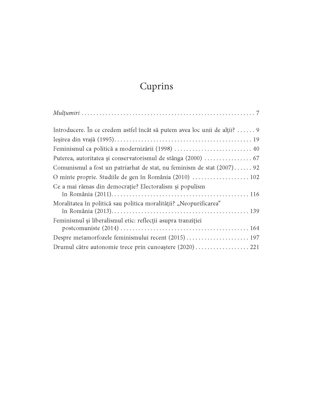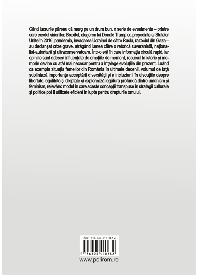 Luând ca exemplu situaţia femeilor din România în ultimele decenii, volumul de faţă subliniază importanţa acceptării diversităţii şi a incluziunii în discuţiile despre libertate, egalitate şi dreptate şi explorează legătura profundă dintre umanism şi feminism, relevând modul în care aceste concepţii transpuse în strategii culturale şi politice pot fi utilizate eficient în lupta pentru drepturile omului.