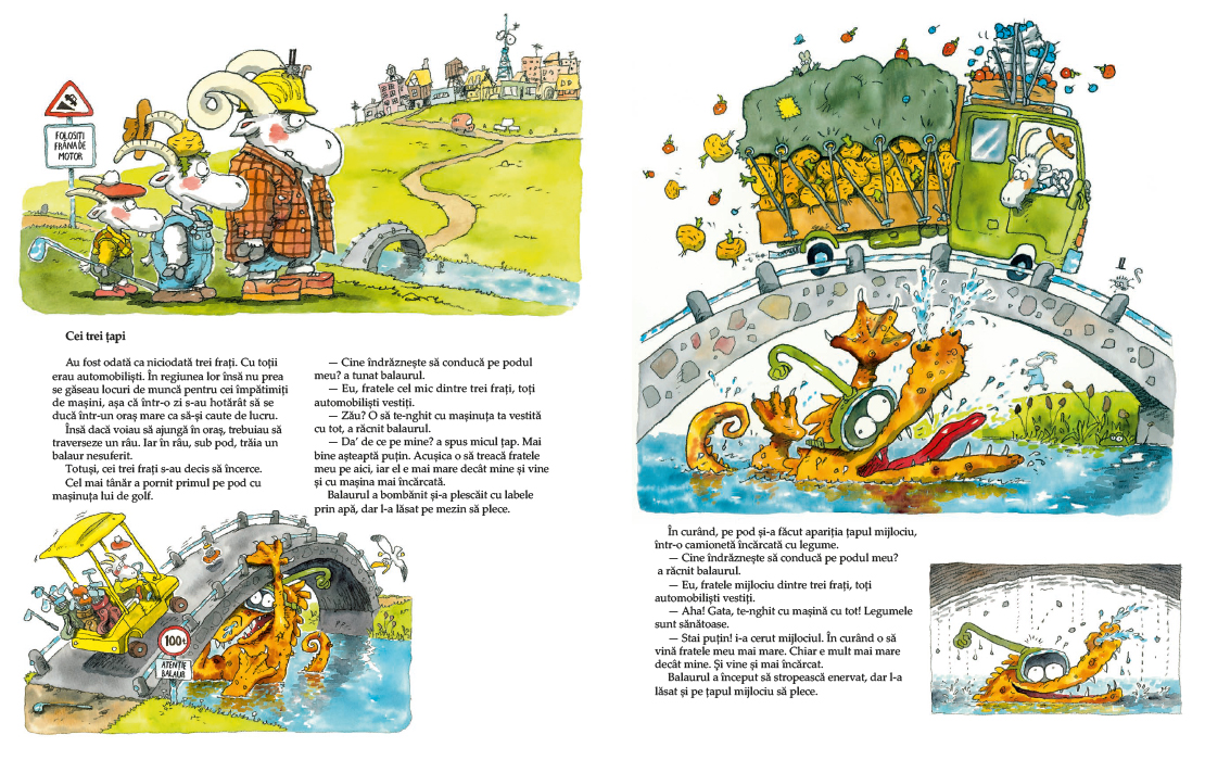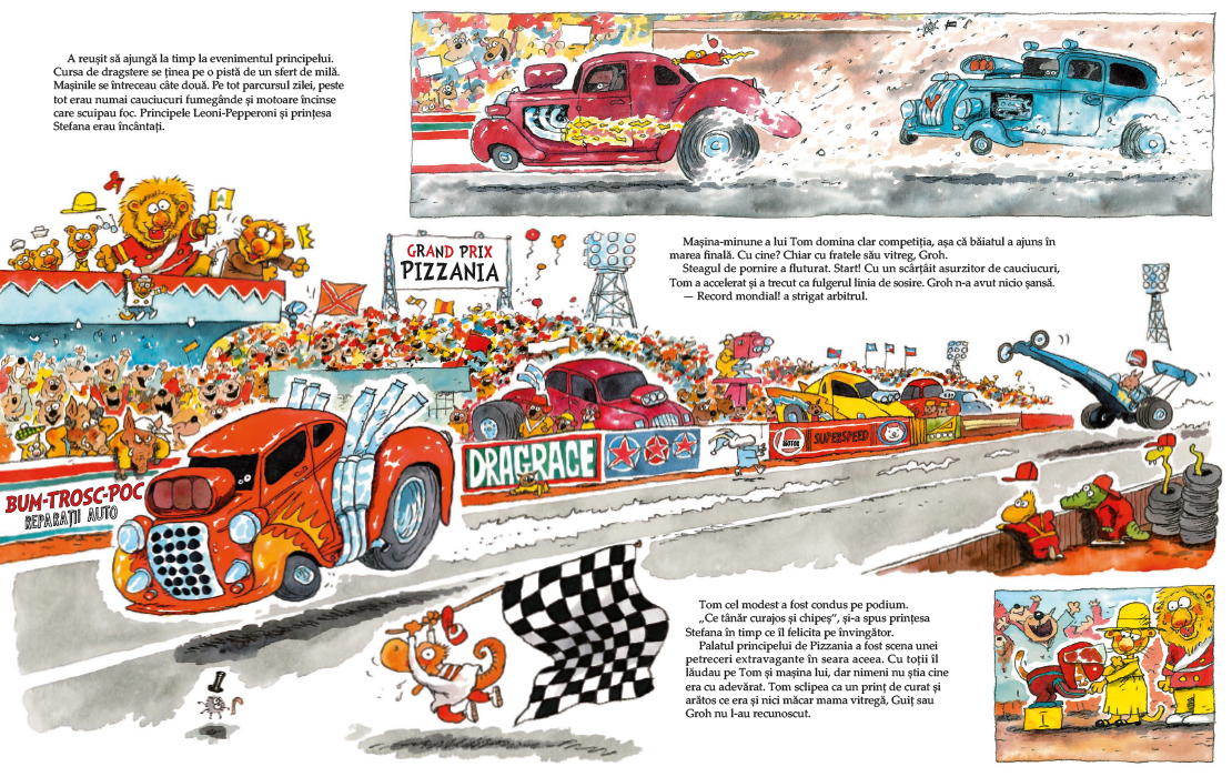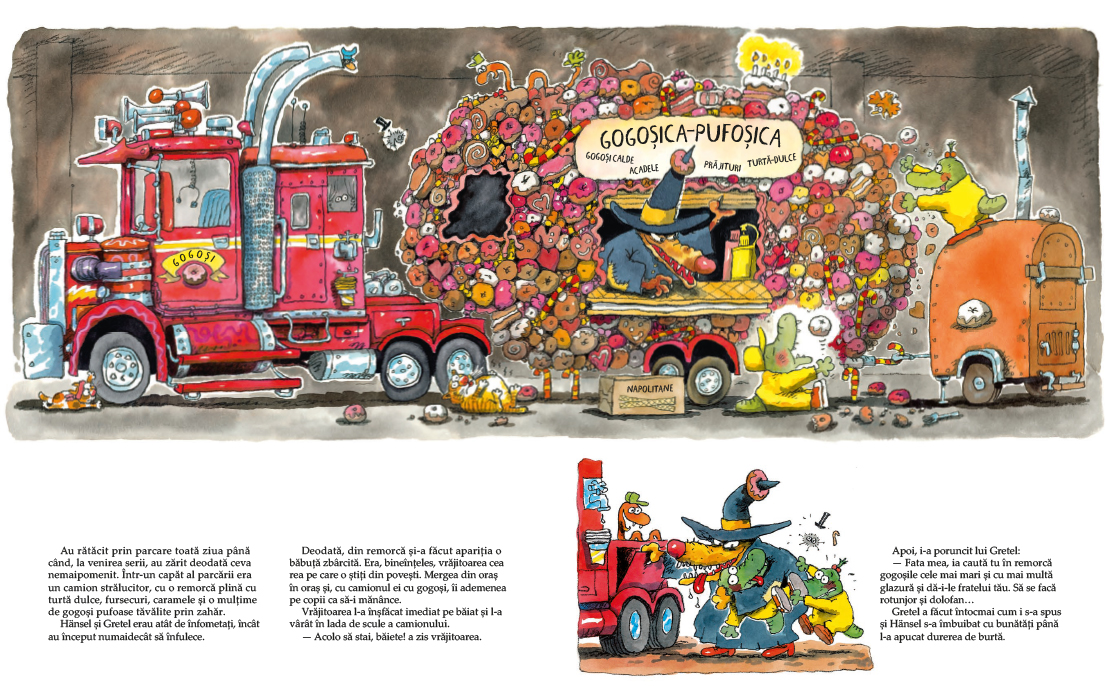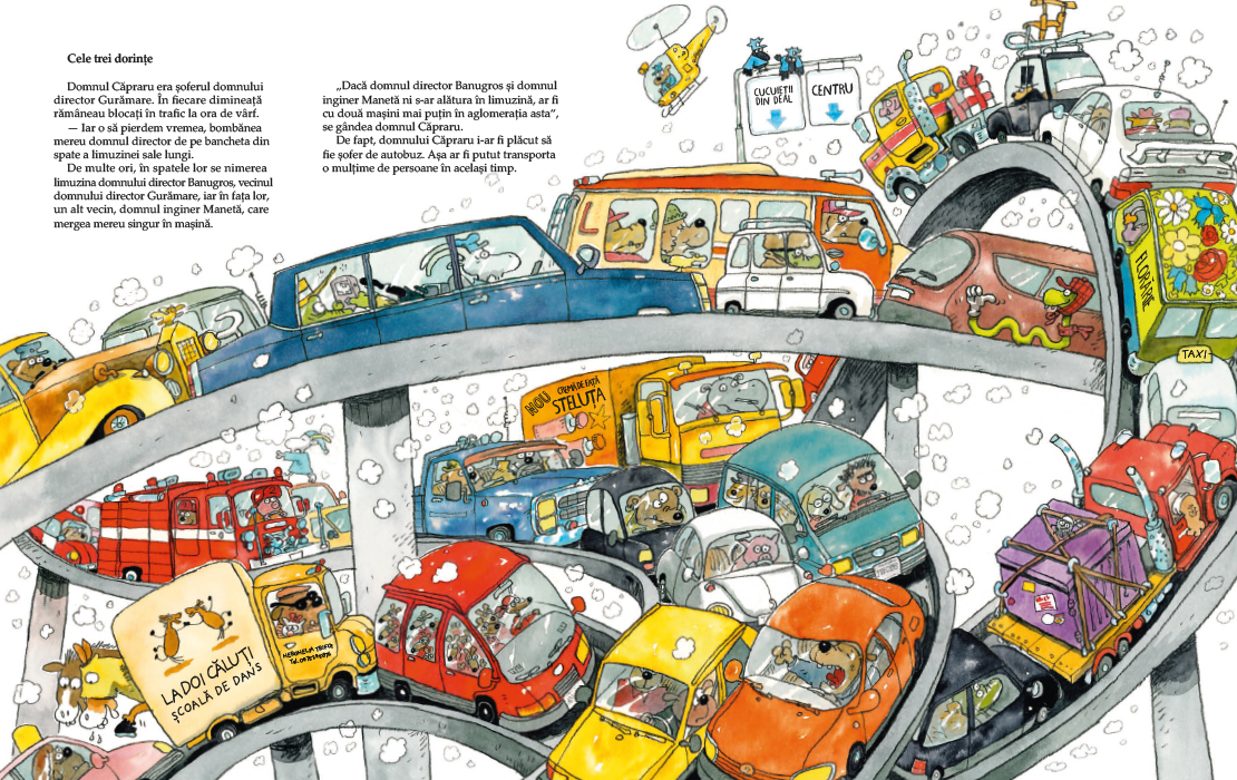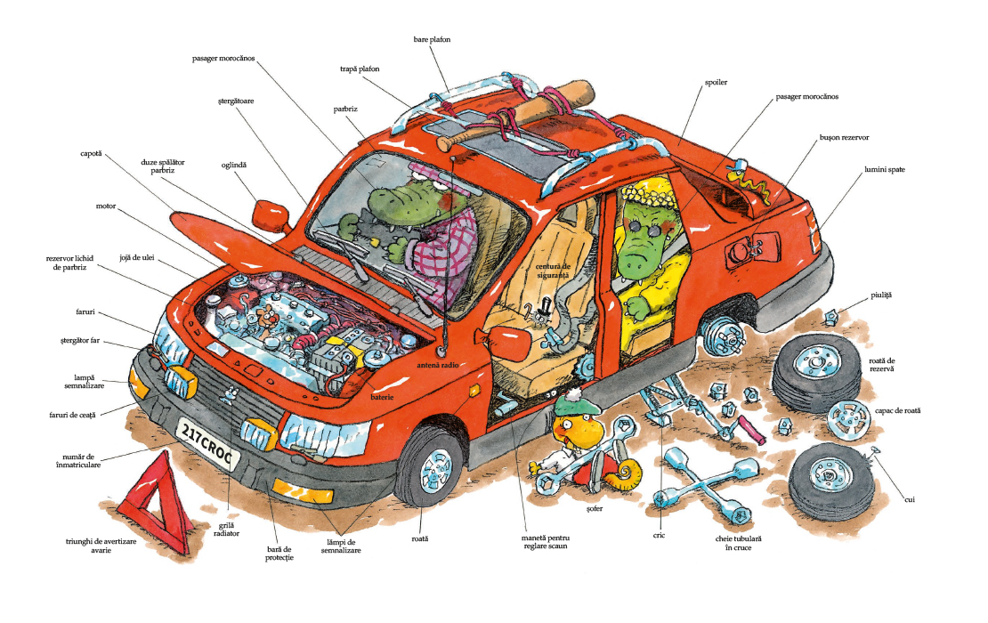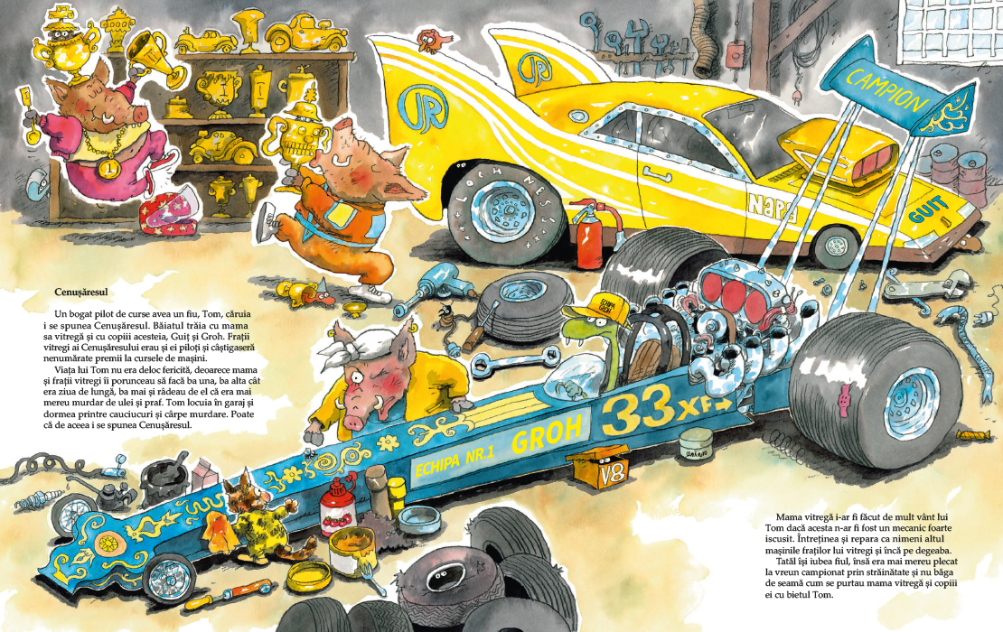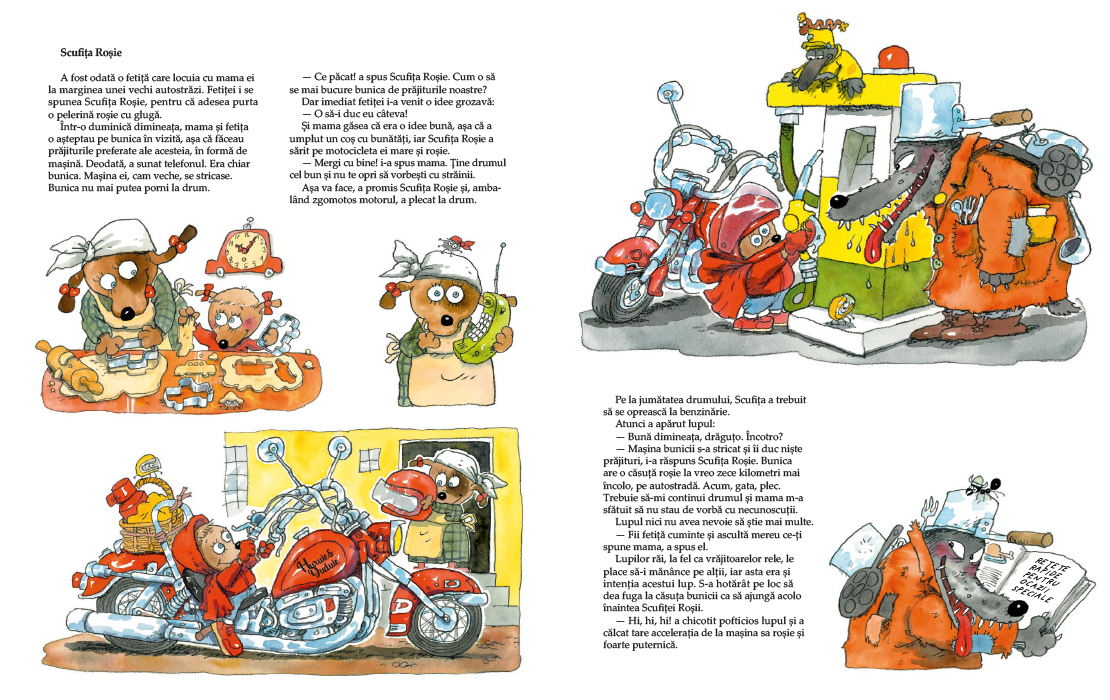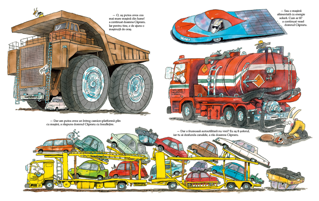 Tot felul de vehicule, reale sau imaginare, au fost create cu fantezie și umor de celebrul Mauri Kunnas pentru a repovesti, spre încântarea tuturor copiilor pasionați de mașini, câteva dintre cele mai cunoscute basme.