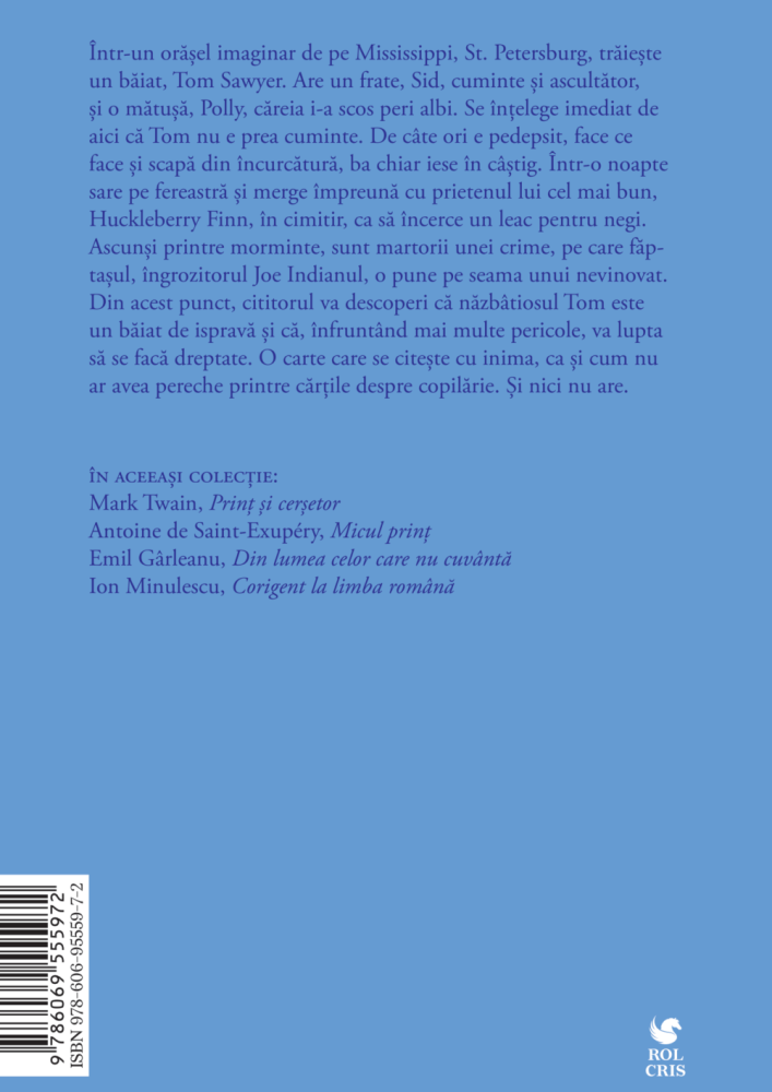 Se întelege imediat de aici ca Tom nu e prea cuminte. De cate ori e pedepsit, face ce face si scapa din încurcatura, ba chiar iese în castig. Într-o noapte sare pe fereastra si merge impreuna cu prietenul lui cel mai bun, Huckleberry Finn, în cimitir, ca sa încerce un leac pentru negi. Ascunsi printre morminte, sunt martorii unei crime, pe care faptasul, ingrozitorul Joe Indianul, o pune pe seama unui nevinovat. Din acest punct, cititorul va descoperi că nazbatiosul Tom este un baiat de isprava si ca, infruntand mai multe pericole, va lupta sa se faca dreptate. O carte care se citeste cu inima, ca si cum nu ar avea pereche printre cartile despre copilarie. Si nici nu are. „Aventurile lui Tom Sawyer l-au plasat pe Mark Twain înca o data in fruntea listei de autori de bestsellere. Probabil niciodata nu a mai aparut in Statele Unite o carte care sa fi fost încontinuu atat de populara.“ Lewis Leary, istoric literar si profesor american de literatura.