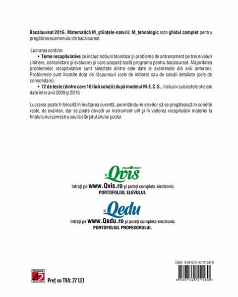 Bacalaureat 2016. Matematica M_stiintele-naturii; M_tehnologic. 72 de teste dupa modelul M.E.C.S. este ghidul complet pentru pregatirea examenului de bacalaureat. Lucrarea contine:
