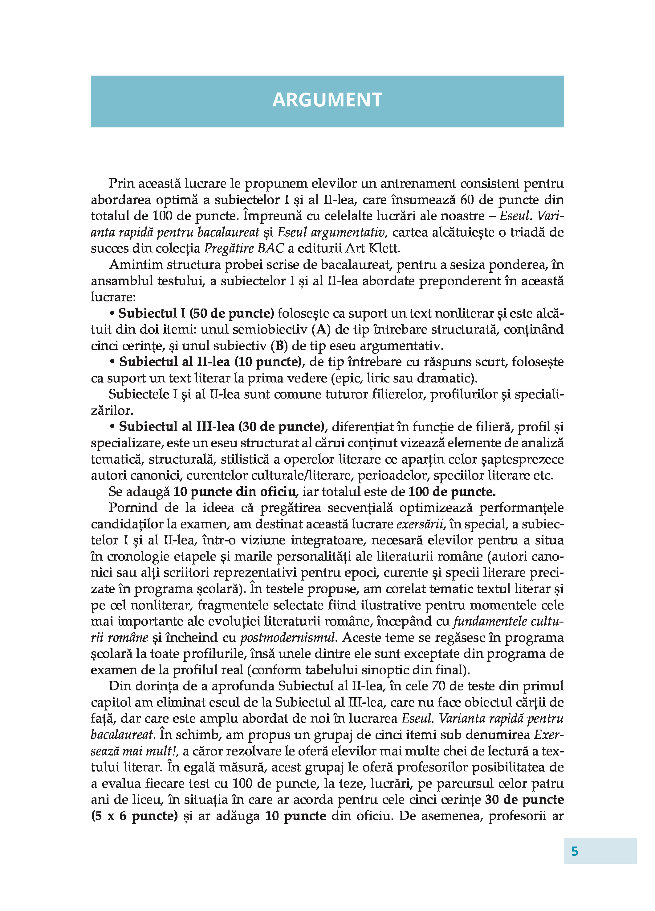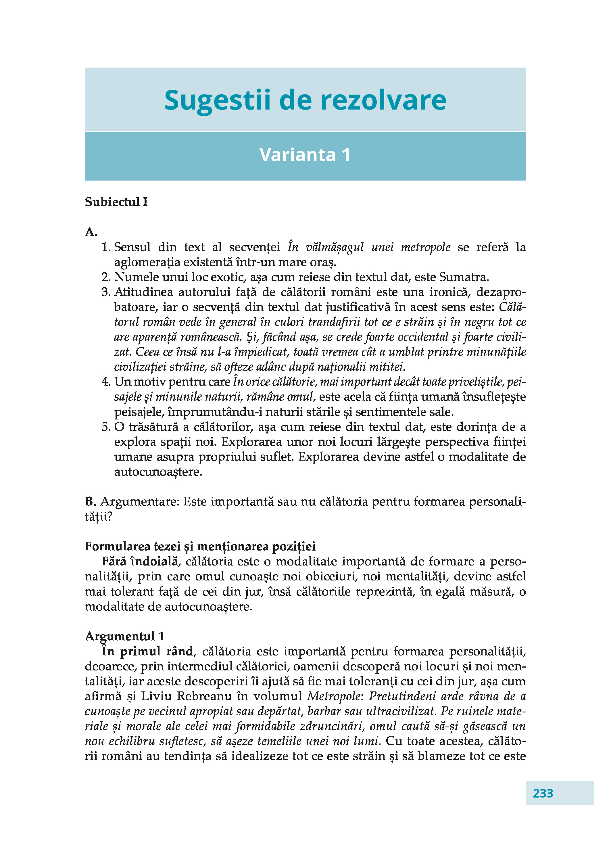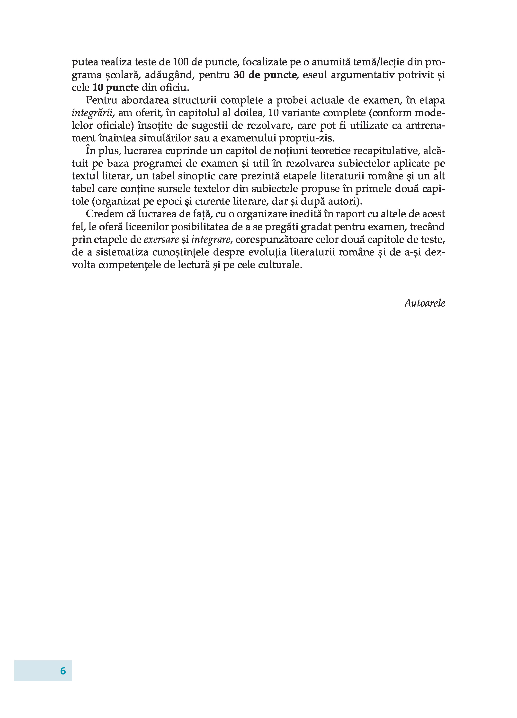 Prin această lucrare le propunem elevilor un antrenament consistent pentru abordarea optimă a subiectelor I şi al II-lea, care însumează 60 de puncte din totalul de 100 de puncte. împreună cu celelalte lucrări ale noastre - Eseul.