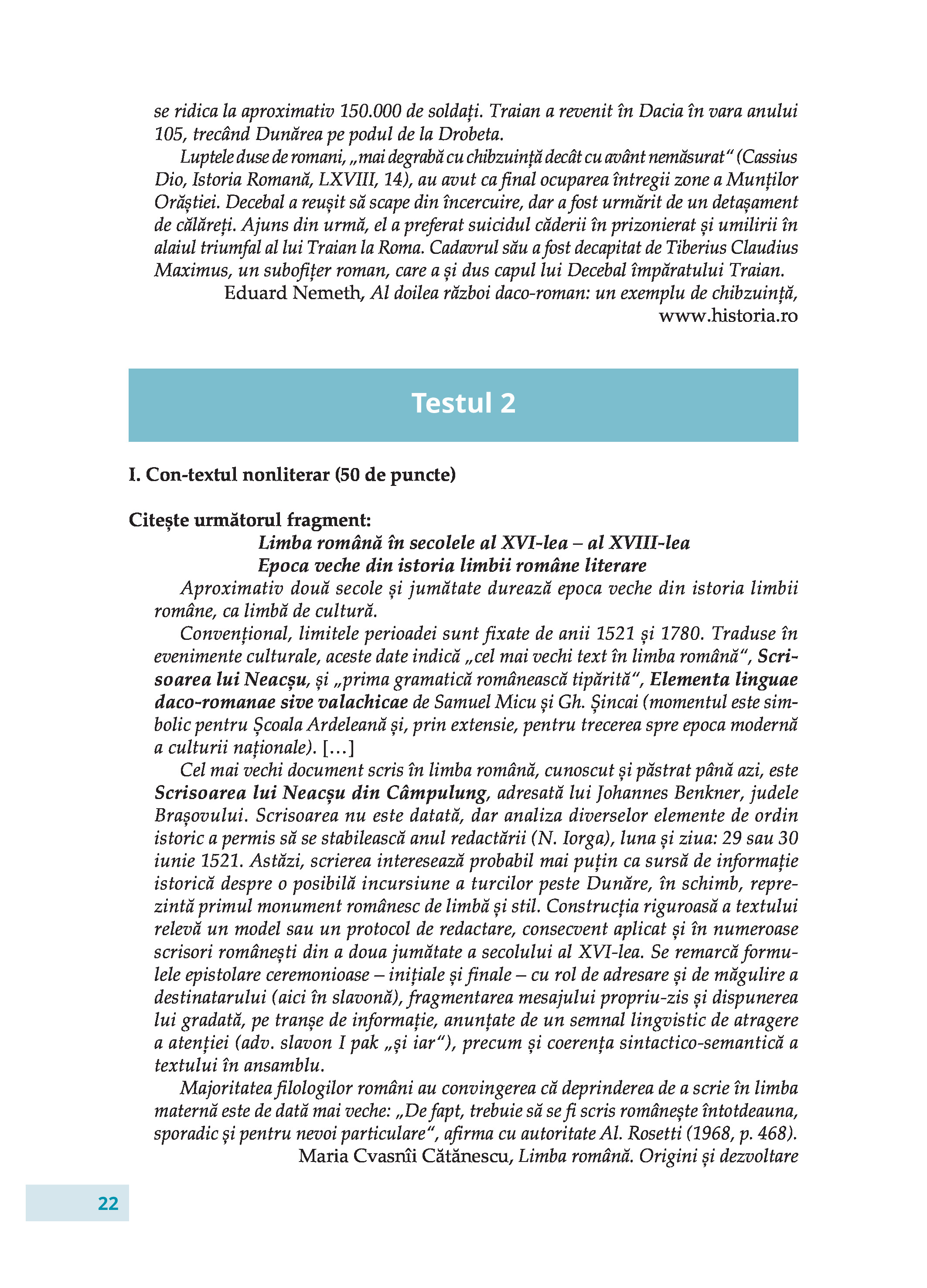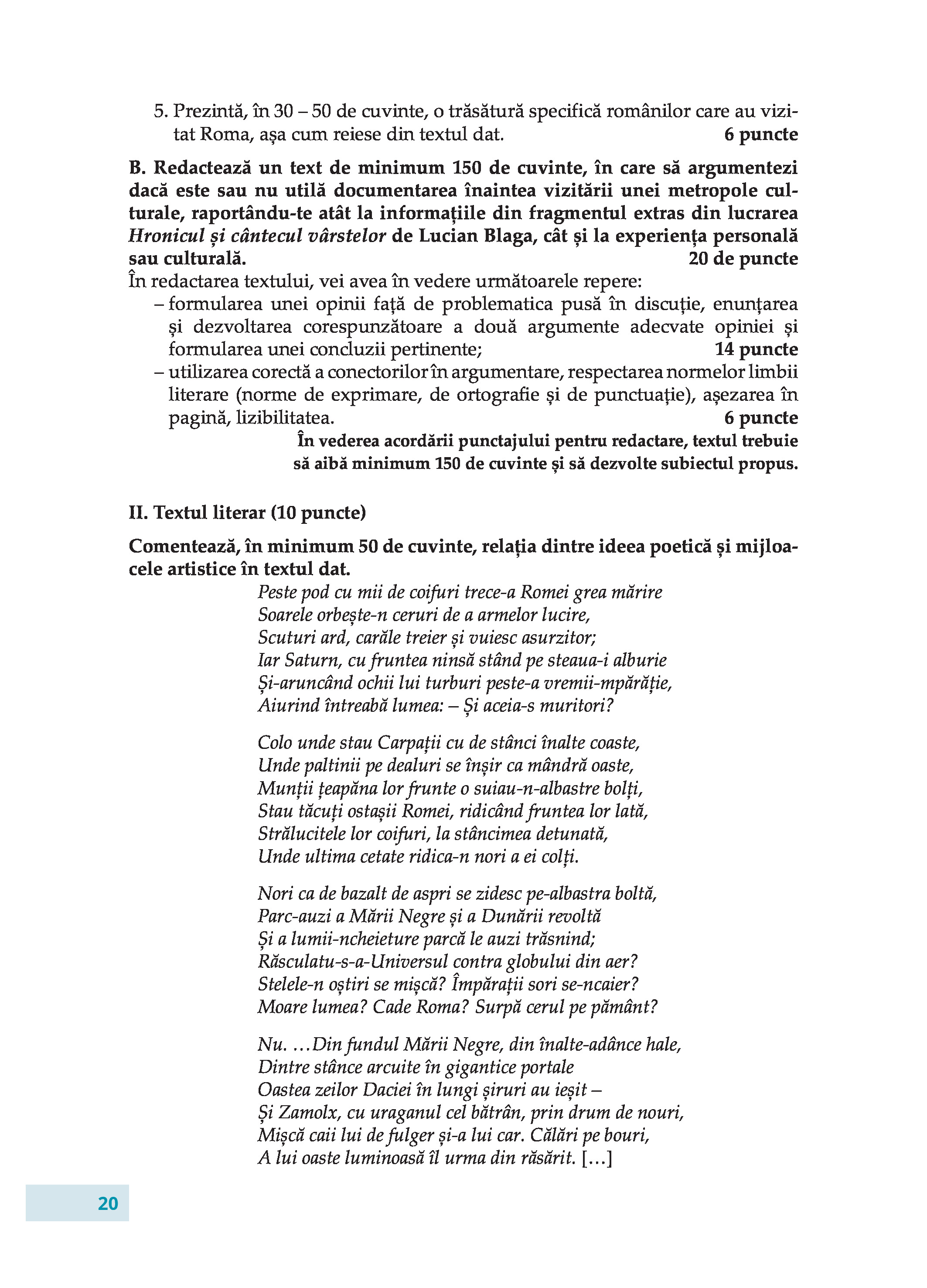 • Subiectul al II-lea (10 puncte), de tip întrebare cu răspuns scurt, foloseşte ca suport un text literar la prima vedere (epic, liric sau dramatic). Subiectele I şi al II-lea sunt comune tuturor filierelor, profilurilor şi specializărilor.Lucrarea a fost avizată de Ministerul Educaţiei şi Cercetării prin Ordinul nr. 6250/21.12.2020 şi se regăseşte la poziţia nr. 19 din anexa Ordinului.