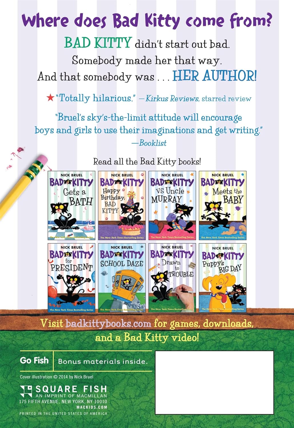 In this seventh installment of the New York Times-bestselling series, Kitty encounters what may be her most formidable foe yet: her creator! Kitty soon learns that feline manipulation works both ways--especially when you're at the wrong end of your author's pencil. Along the way, Nick shows kids how a book is created, despite the frequent interruptions from you-know-who.