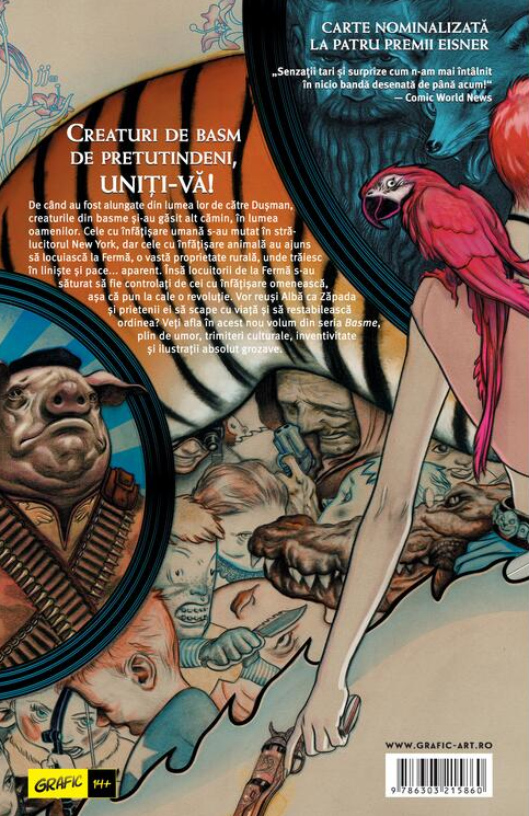De când au fost alungate din lumea lor de către Dușman, creaturile din basme și-au găsit alt cămin, în lumea oamenilor. Cele cu înfățișare umană s-au mutat în strălucitorul New York, dar cele cu înfățișare animală au ajuns să locuiască la Fermă, o vastă proprietate rurală, unde trăiesc în liniște și pace... aparent. Însă locuitorii de la Fermă s-au săturat să fie controlați de cei cu înfățișare omenească, așa că pun la care o revoluție. Vor reuși Albă ca Zăpada și prietenii ei să scape cu viață și să restabilească ordinea? Veți afla în acest nou volum din seria Basme, plin de umor, trimiteri culturale, inventivitate și ilustrații absolut grozave.