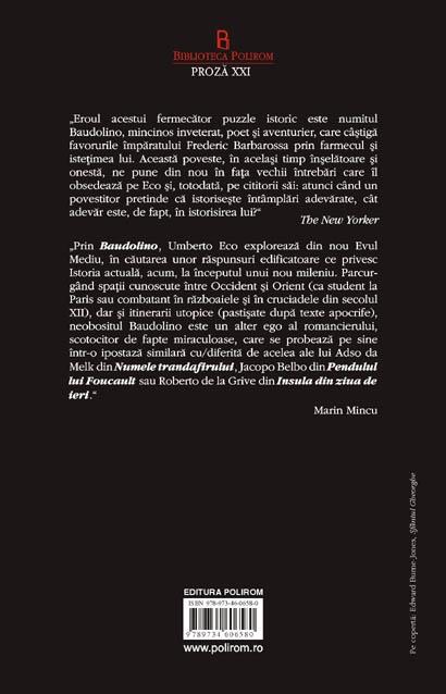 „Prin Baudolino, Umberto Eco exploreaza din nou Evul Mediu, in cautarea unor raspunsuri edificatoare ce privesc Istoria actuala, acum, la inceputul unui nou mileniu. Parcurgind spatii cunoscute intre Occident si Orient (ca student la Paris sau combatant in razboaiele si in cruciadele din secolul XII), dar si itinerarii utopice (pastisate dupa texte apocrife), neobositul Baudolino este un alter ego al romancierului, scotocitor de fapte miraculoase, care se probeaza pe sine intr-o ipostaza similara cu/diferita de acelea ale lui Adso da Melk din Numele trandafirului, Jacopo Belbo din Pendulul lui Foucault sau Roberto de la Grive din Insula din ziua de ieri.” (Marin Mincu)