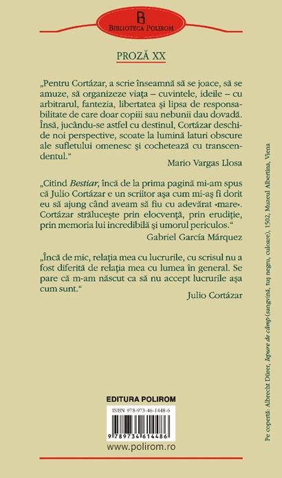 „Citind Bestiar,inca de la prima pagina mi-am spus ca Julio Cortazar e un scriitor asa cum mi-as fi dorit eu sa ajung cind aveam sa fiu cu adevarat «mare». Cortazar straluceste prin elocventa, prin eruditie, prin memoria lui incredibila si umorul periculos.” (Gabriel García Marquez)