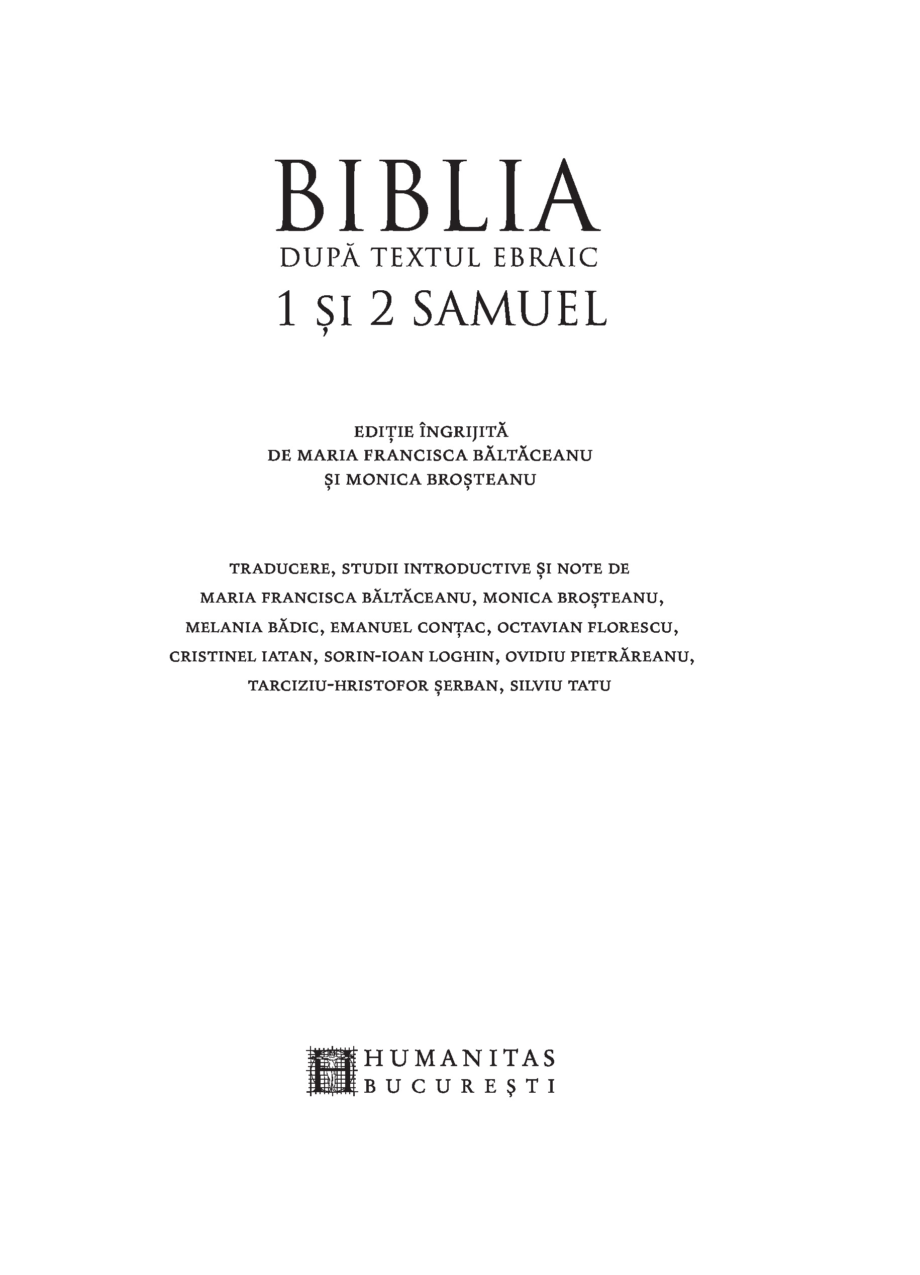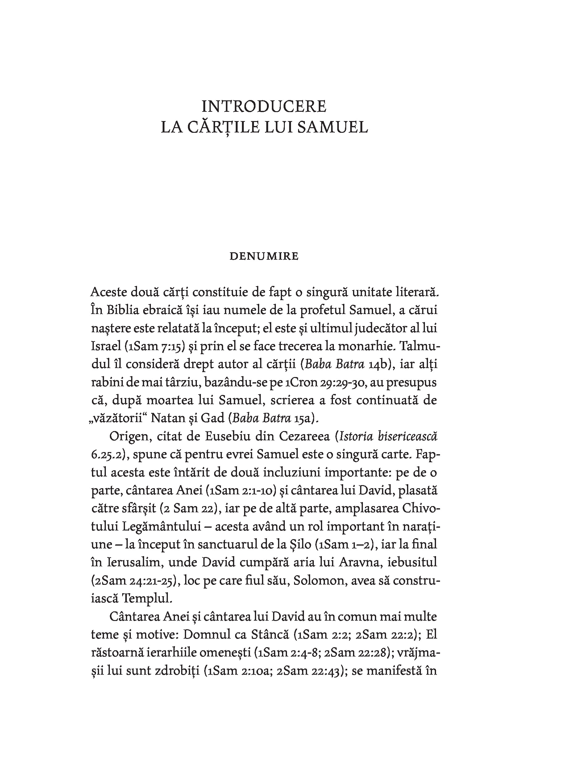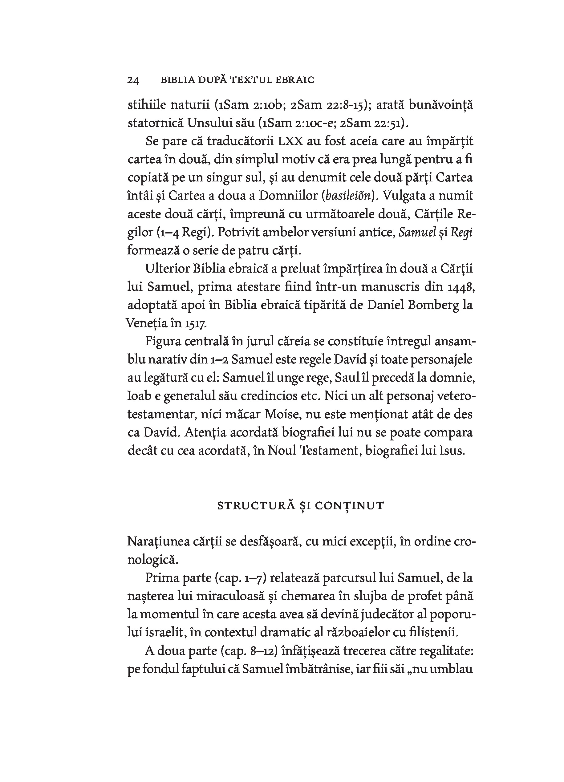 Volumul de față, 1 și 2 Samuel, este al cincilea dintr-o serie care va cuprinde traducerile tuturor textelor Bibliei ebraice și al doilea din secțiunea a doua a acesteia, Neviim („Profeții“), însoțite de studii introductive, note și comentarii.