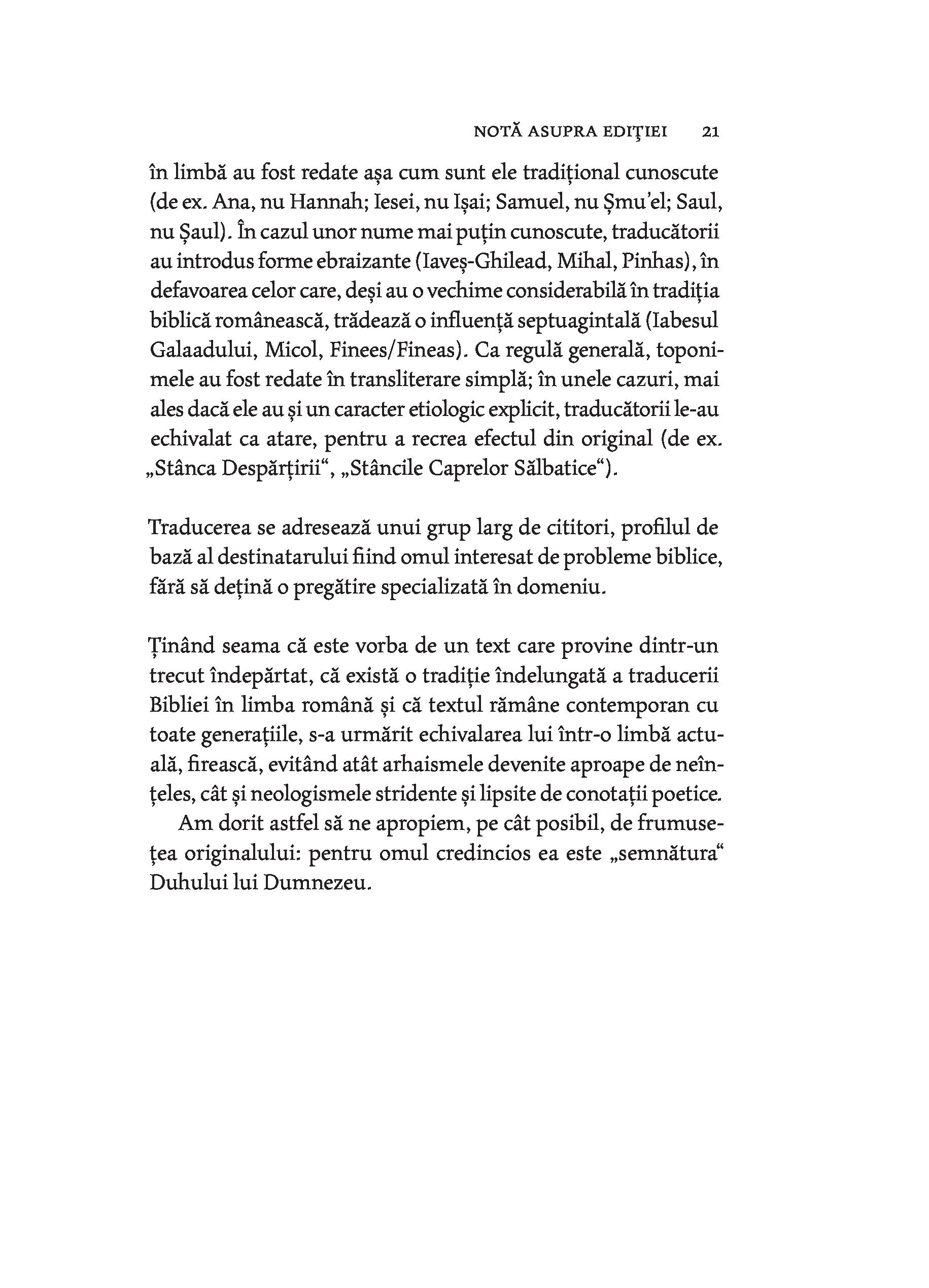 „Textul Bibliei confirmă, prin structura şi istoria lui, teologia Treimii. Căci el are trei autori: Dumnezeu (inspiratorul lui suprem, izvorul Revelaţiei), autorii textului consemnat în scris (primitorii şi transmiţătorii Revelaţiei) şi traducătorii textului originar. Cu volumul de faţă, ne aflăm în prezenţa traducătorilor, exponenţi ai «vorbirii în limbi», mediatori ai Duhului, păstori ai cuvintelor aflate în căutarea Cuvântului. Ei merită toată admiraţia noastră. Pentru că reuşesc să pună erudiţia cea mai temeinică în serviciul cordialităţii, al nevoii de a înţelege ceea ce e dincolo de înţelegerea obişnuită.“