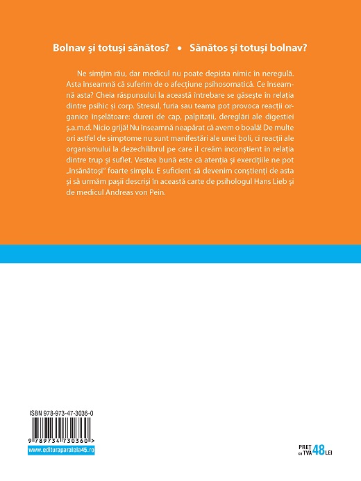 Ne simțim rău, dar medicul nu poate depista nimic în neregulă. Asta înseamnă că suferim de o afecțiune psihosomatică. Ce înseamnă asta? Cheia răspunsului la această întrebare se găsește în relația dintre psihic și corp. Stresul, furia sau teama pot provoca reacții organice înșelătoare: dureri de cap, palpitații, dereglări ale digestiei ș.a.m.d. Nicio grijă! Nu înseamnă neapărat că avem o boală! De multe ori astfel de simptome nu sunt manifestări ale unei boli, ci reacții ale organismului la dezechilibrul pe care îl creăm inconștient în relația dintre trup și suflet. Vestea bună este că atenția și exercițiile ne pot „însănătoși“ foarte simplu. E suficient să devenim conștienți de asta și să urmăm pașii descriși în această carte de psihologul Hans Lieb și de medicul Andreas von Pein.