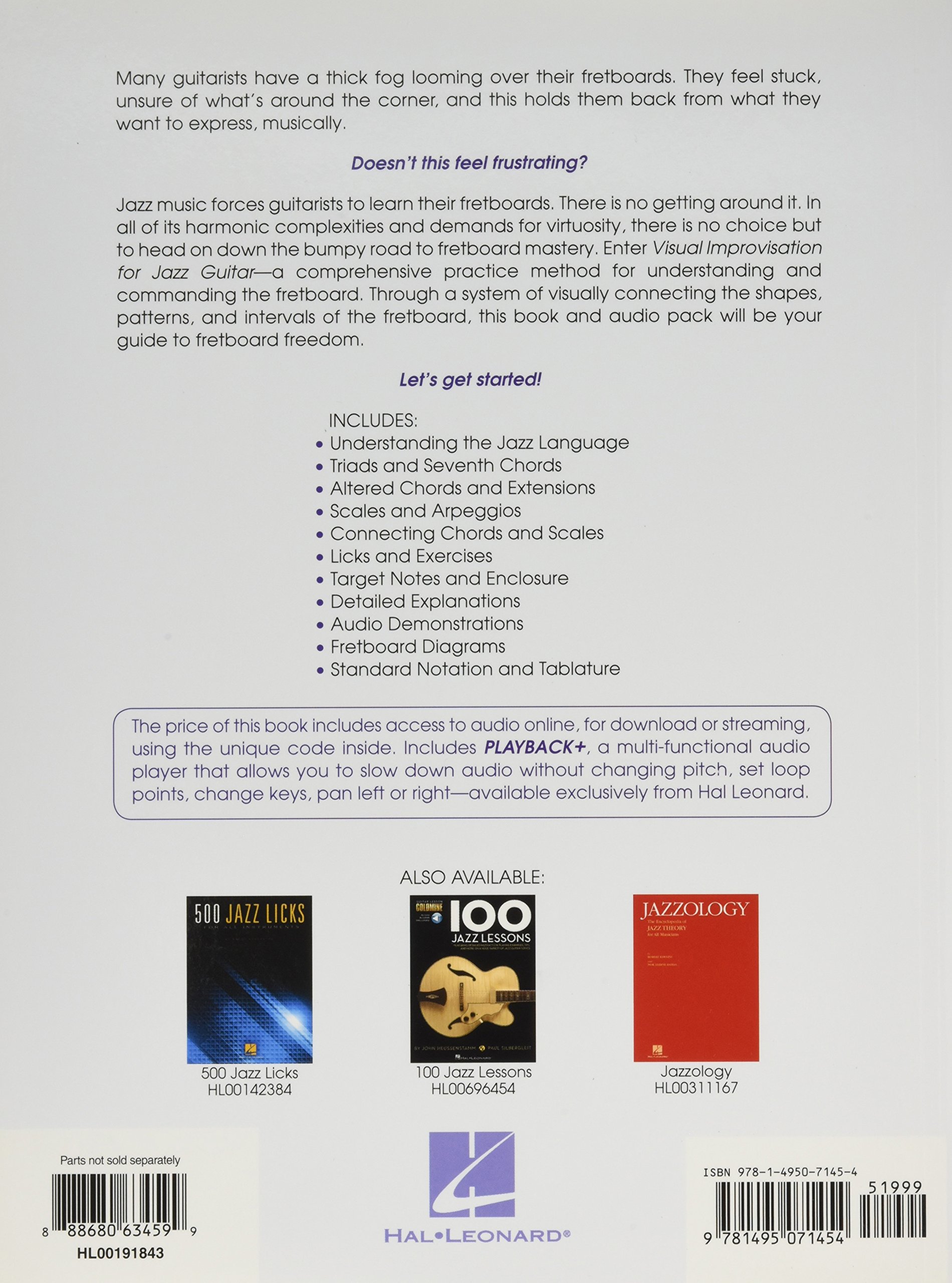 (Guitar Educational). Jazz music forces guitarists to learn their fretboards. There is no getting around it. In all of its harmonic complexities and demands for virtuosity, there is no choice but to head on down the bumpy road to fretboard mastery. Enter Visual Improvisation for Jazz Guitar a comprehensive practice method for understanding and commanding the fretboard. Through a system of visually connecting the shapes, patterns, and intervals of the fretboard, this book and audio pack will be your guide to fretboard freedom. Topics include: triads and seventh chords; altered chords and extensions; scales and arpeggios; licks and exercises; audio demonstrations; fretboard diagrams; and much more! The price of this book includes access to audio online, for download or streaming, using the unique code inside. Includes PLAYBACK+, a multi-functional audio player that allows you to slow down audio without changing pitch, set loop points, change keys, pan left or right.