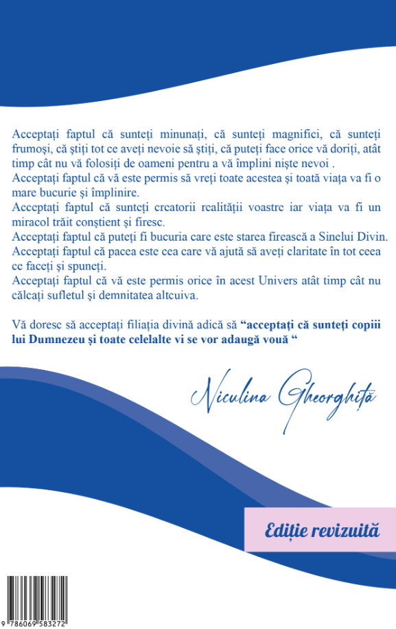 • vă este permis orice în acest Univers atât timp cât nu călcați sufletul și demnitatea altcuiva. Vă doresc să acceptați filiația divină adică să “acceptați că sunteți copiii lui Dumnezeu și toate celelalte vi se vor adăuga vouă “