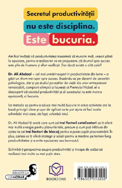 Astfel, în Bucuria productivității, el îți explică de ce emoțiile pozitive sunt cheia productivității, dar și cum le poți cultiva în viața ta prin strategii ușor de aplicat. Aceasta îți arată care sunt cei trei factori catalizatori ce îți oferă mai multă energie pentru planurile tale, precum și cum poți înlătura din calea ta cei trei factori de blocaj pentru a pune capăt procrastinării. În plus, cartea sa îți oferă soluții pentru a menține pe termen lung productivitatea și a evita epuizarea sau burnoutul.