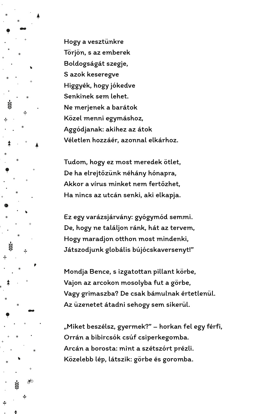 "Lázas a pláza, izzad a menza! / Ez nem lehet sima influenza!" A sztorit mind ismerjük, hiszen nemrég mind otthon gugyultunk, játszottuk a nagy "bújócskaversenyt". André Ferenc könyve szavakkal karatézza le a koronavírust, a történet vígan bugivugizik, és kiderül, hogy egy járvány megfékezéséhez nem kell semmi más, mint néhány leleményes zokni, egy príma ötlet, egy agyafúrt gyerek meg egy virgonc elnök.