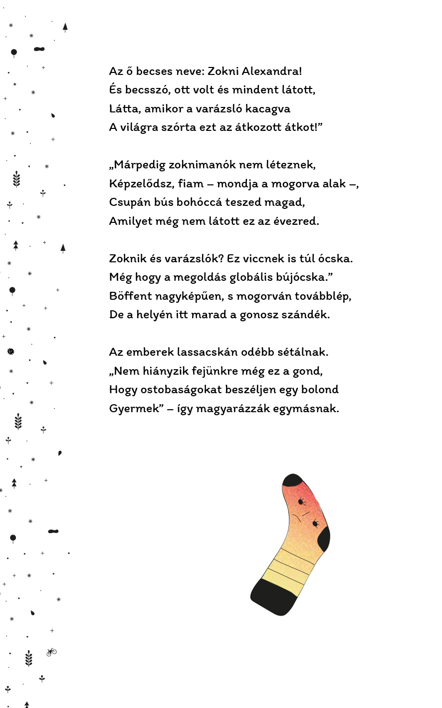Ki szabadított vírust a világra? Igaz, hogy varázsvírus? Tényleg lesz apokalipszis? Segít a globális bújócskaverseny? Léteznek zoknimanók? Ténlyeg Zokniországban laknak, túl a Süveg-hegyen? Mi lesz, ha leblokkol a zokniportál? Ki csodálja a zokniholdat? Hogy jön mindehhez Zokkenberg, Papucs Pippin, Bocskor Barbi és Bakants Mihály? Milyen hosszú Pamut-hegytől Gyapot-szigetekig az út? Ki szervezi a karanténkoncertet? Lapozz, és megtudod. Bónusz: egy elgurult varázskorona.