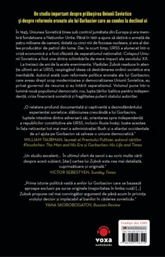 La treizeci de ani de la acele evenimente, Vladislav Zubok readuce în atenție ultimii ani ai URSS, respingând ideea că destrămarea ordinii sovietice era inevitabilă. Autorul arată cum reformele politice eronate ale lui Gorbaciov, care aveau drept scop modernizarea și democratizarea Uniunii Sovietice, au privat guvernul de resurse și au întărit separatismul. Volumul pune într-o lumină nouă populismul democratic rus, lupta țărilor baltice pentru independență, criza financiară sovietică și fragilitatea puterii statului autoritar.