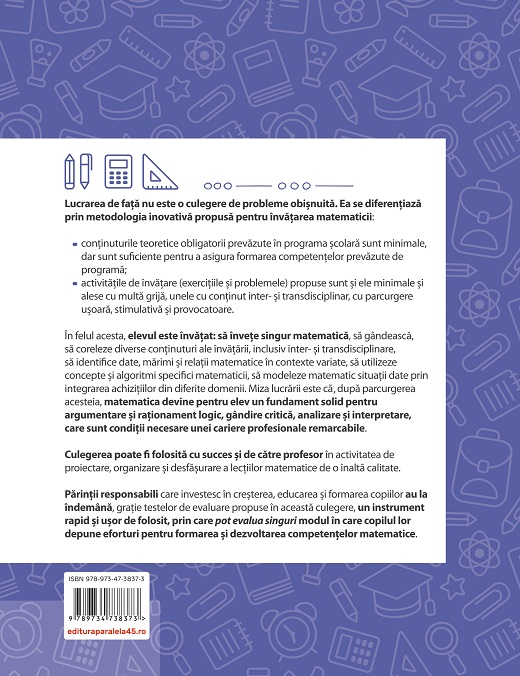 Părinții responsabili, care investesc în creșterea, educarea și formarea copiilor, au la îndemână, grație testelor de evaluare propuse în această culegere, un instrument rapid și ușor de folosit, prin care pot evalua singuri modul în care copilul lor depune eforturi pentru formarea și dezvoltarea competențelor matematice.