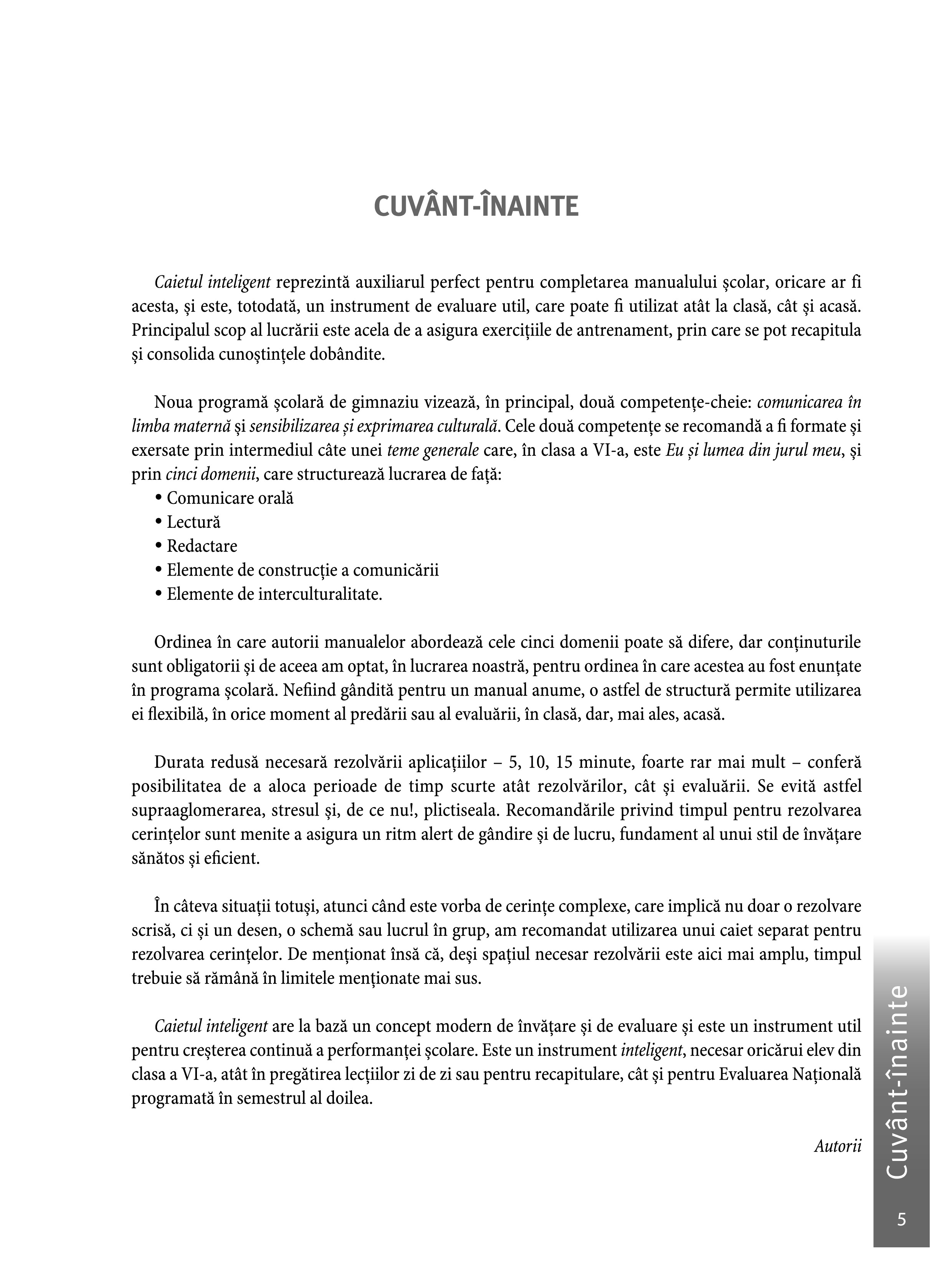 Prezentul auxiliar a fost avizat de Ministerul Educaţiei Naţionale prin Ordinul nr. 3022 din 08.01.2018 pentru anul şcolar 2017-2018 şi se regăseşte la poziţia nr. 235 din anexa Ordinului. Lucrarea este realizată în conformitate cu Programa şcolară pentru disciplina Limba şi literatura română, clasele a Vl-a- a VIII-a în vigoare, aprobată prin OM Nr. 3393/28.02.2017
