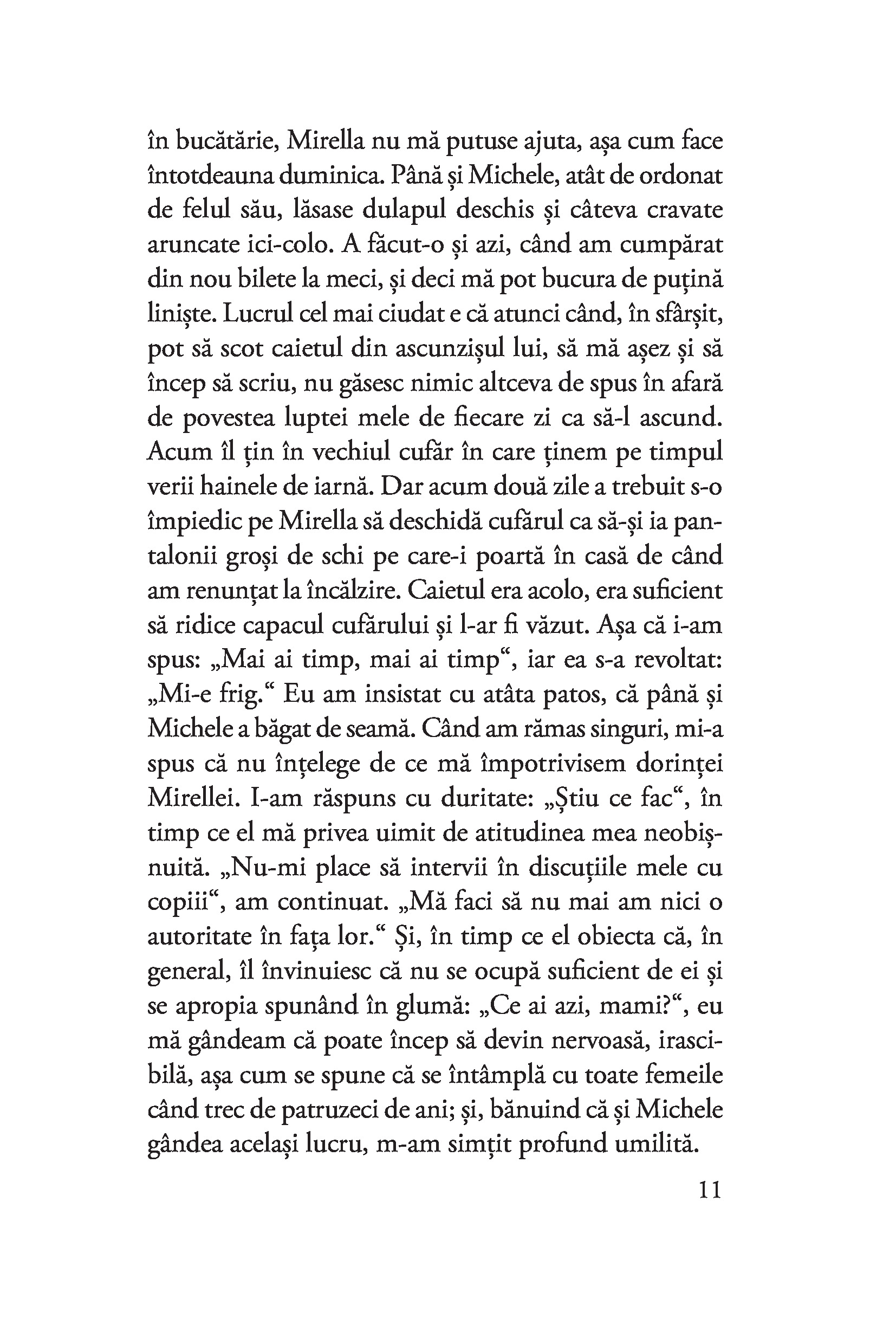De-a lungul acestei introspecții, se ivesc treptat toate dorințele reprimate și aspirațiile ei. Caietul interzis e o călătorie profundă și sensibilă în adâncurile sufletului feminin.