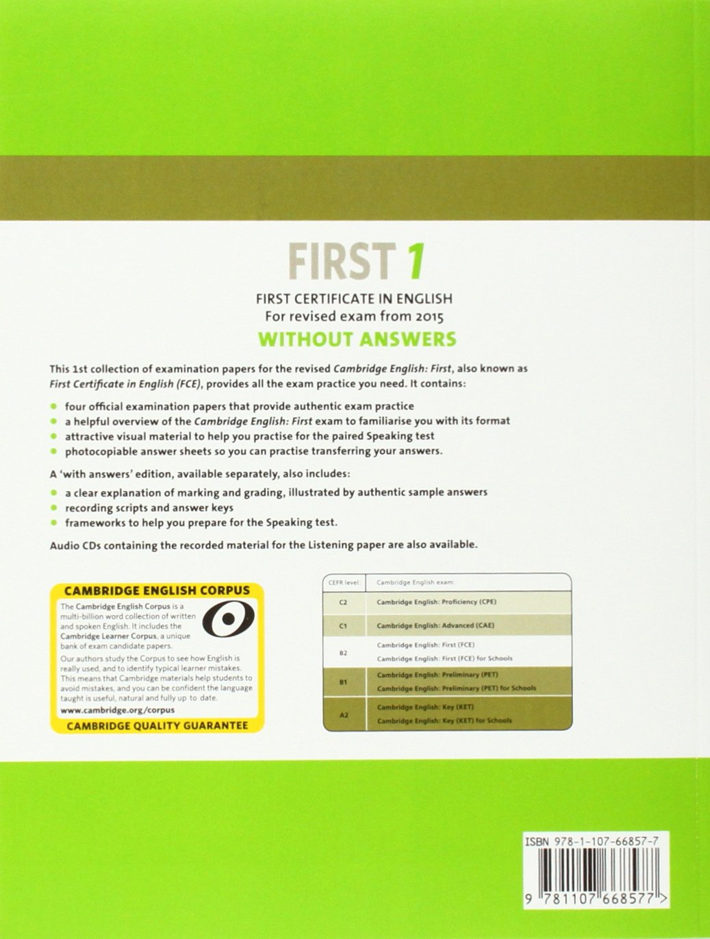 Four authentic Cambridge English Language Assessment examination papers for the revised Cambridge English: First (FCE) exam from 2015 These examination papers for the Cambridge English: First (FCE) exam provide the most authentic exam preparation available, allowing candidates to familiarise themselves with the content and format of the revised 2015 Cambridge English: First exam and to practise useful exam techniques. The Student's Book without answers is perfect for classroom-based test practice.