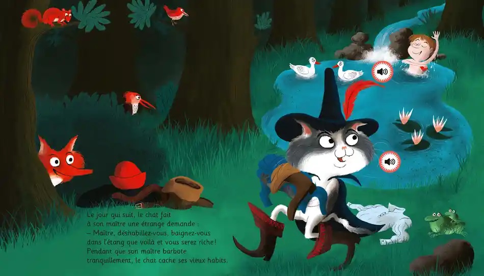 Découvre Le Chat botté et amuse-toi, à chaque page, à faire "sonner" les puces ! Ecoute le rusé chat attraper les perdrix pour son maître et héler le carrosse du roi. Entends le chat transformer l'ogre en souris pour prendre possession du château. Ecoute-le célébrer en musique les noces de son maître devenu le marquis de Carabas. Avec des compositions originales et de vrais instrument. Appuie sur les icônes et écoute les sons.