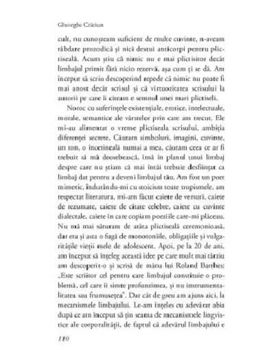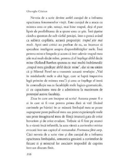 „N‑are rost să mă mai învârt în jurul cozii. Toată problema este de fapt interioritatea mea. Este, dacă vreți, raportul cu sinele, cu ceea ce în mod impropriu se cheamă eu. Chiar dacă pentru foarte mulți oameni cel mai important lucru din lume e propriul lor eu, eul acesta nu există, pentru că el e o relație și nimic mai mult decât o relație între un punct care vede și un punct care este văzut, între o prezență care gândește și o prezență care e gândită.” (Gheorghe Crăciun)