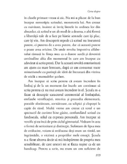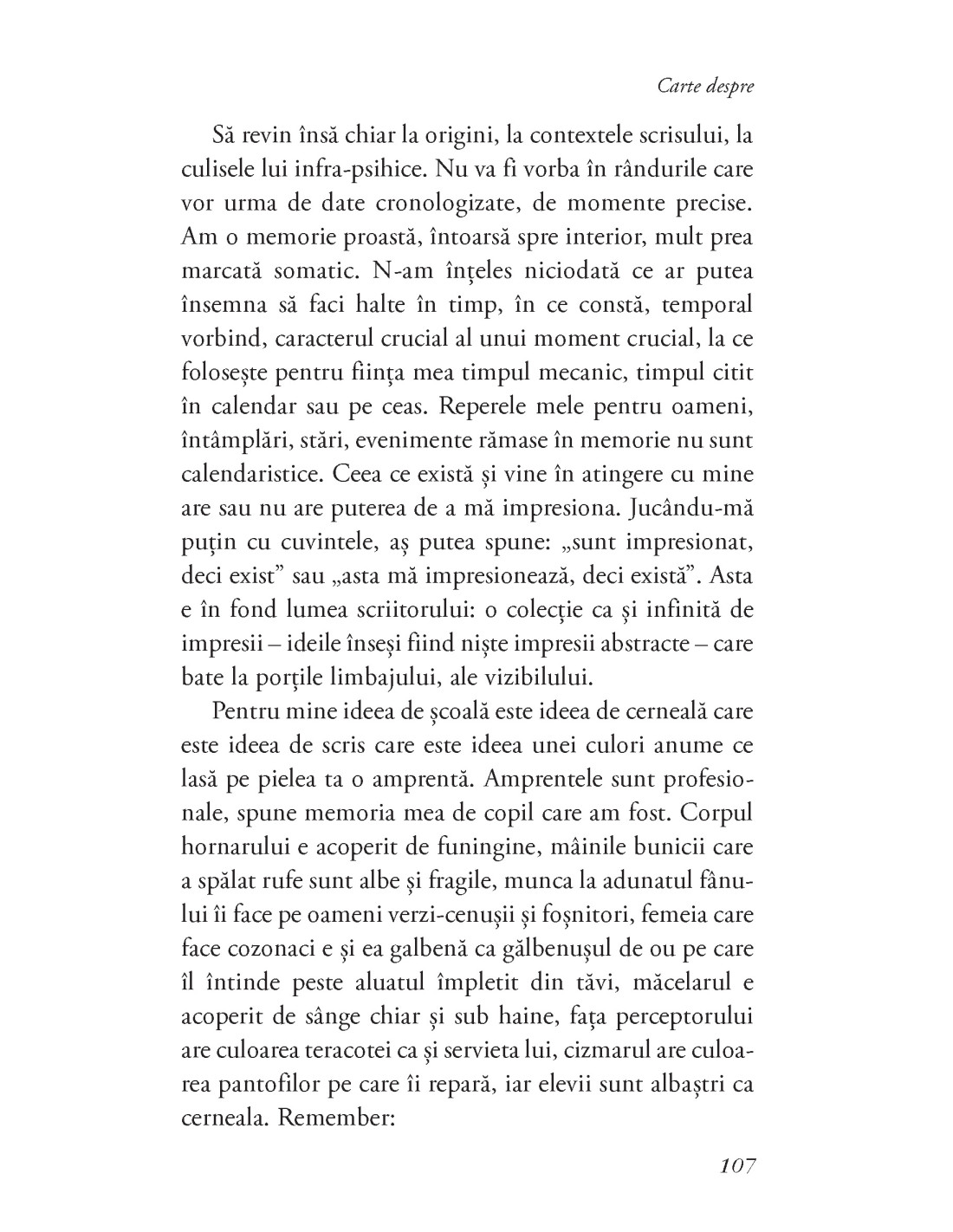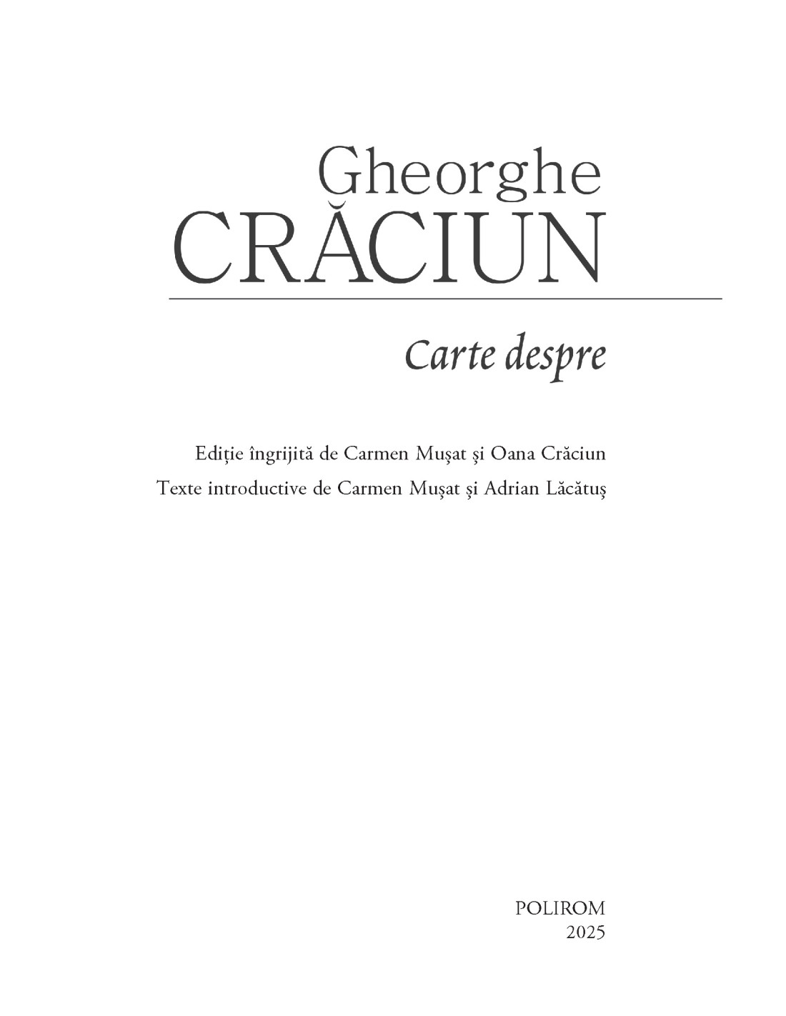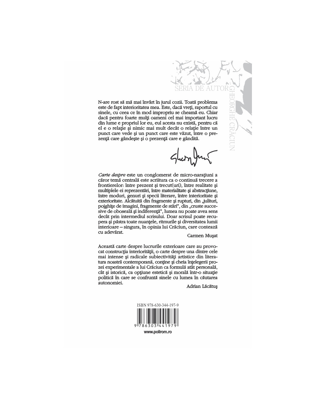 „Carte despre este un conglomerat de micro-narațiuni a căror temă centrală este scriitura ca o continuă trecere a frontierelor: între prezent și trecut(uri), între realitate și multiplele ei reprezentări, între materialitate și abstracțiune, între moduri, genuri și specii literare, între interioritate și exterioritate. Alcătuită din fragmente și rupturi, din „julituri, pojghițe de imagini, fragmente de stări”, din „cruste succesive de oboseală și indiferență”, lumea nu poate avea sens decât prin intermediul scrisului. Doar scrisul poate recupera și păstra toate nuanțele, ritmurile și diversitatea lumii interioare – singura, în opinia lui Crăciun, care contează cu adevărat.” (Carmen Mușat)