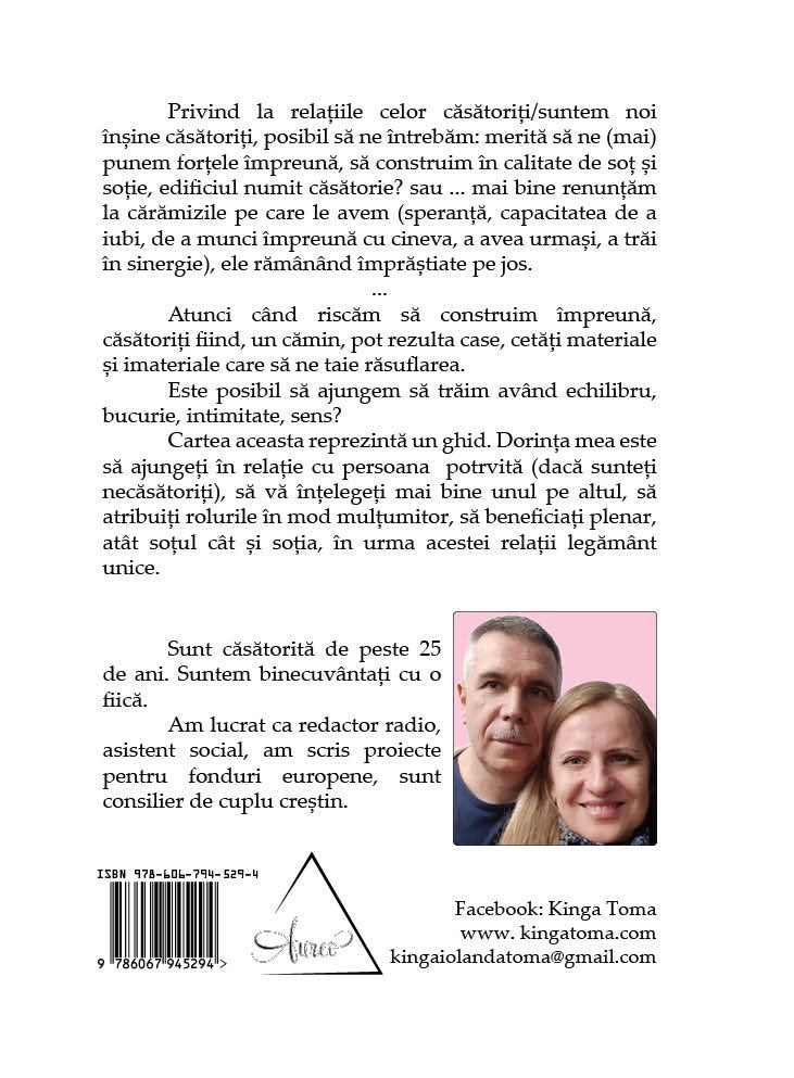 Ea propune un ghid al rezolvării acestor obstacole din calea unității și armoniei cuplului căsătorit cuprinzând aportul personal pentru realizarea stării de bine, acordarea de energie pentru ajungerea la un acord real, cunoasterea limbajelor iubirii partenerului de cuplu, adoptarea unor ritualuri ale conexiunii, pașii constitutivi ai unei comunicari prietenoase. Casa de piatra, care ne este urată la încheierea căsătoriei, este o entitate fragilă. Ea este plămădită din credințe, gesturi, gânduri, acțiuni, pe care le avem în fiecare zi.