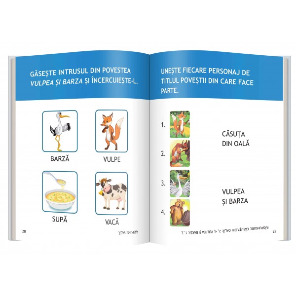 • carte cu cele două povești și activități pe baza acestora. Cuvintele sunt scrise cu majuscule, iar silabele sunt colorate diferit.